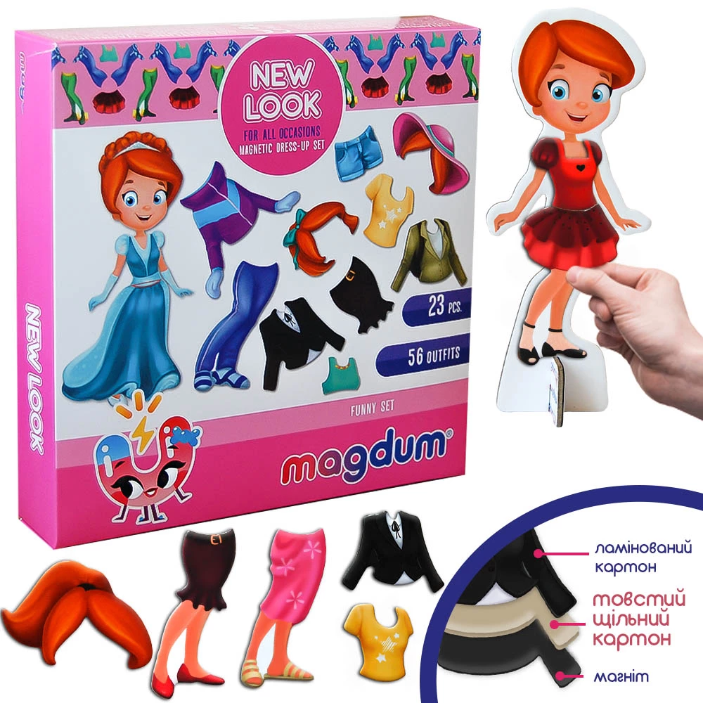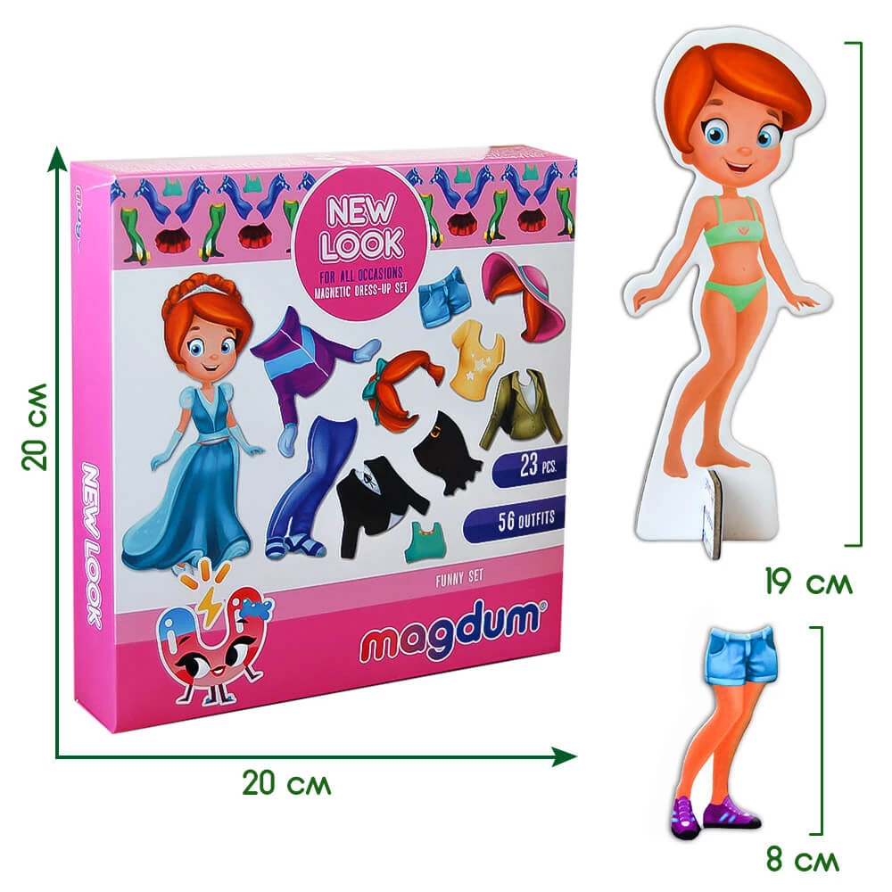 У гарній коробці ви знайдете 23 магніти, за допомогою яких можна створити 56 різних образів. Просто комбінуйте спідниці, кофточки, штани та зачіски.