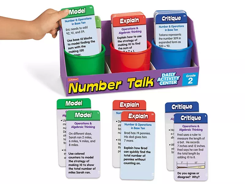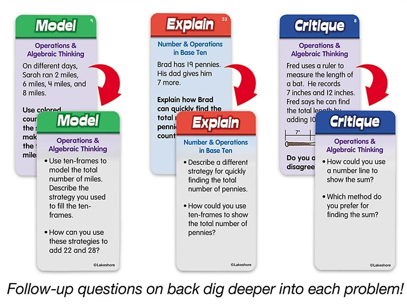 Представлений набір від торгової марки Lakeshore для другокласників містить картки із завданнями з математики. Він включає 120 карток, розділених на 3 категорії і спонукає учнів моделювати математичні концепції, пояснювати хід своїх думок і критикувати міркування опонентів.