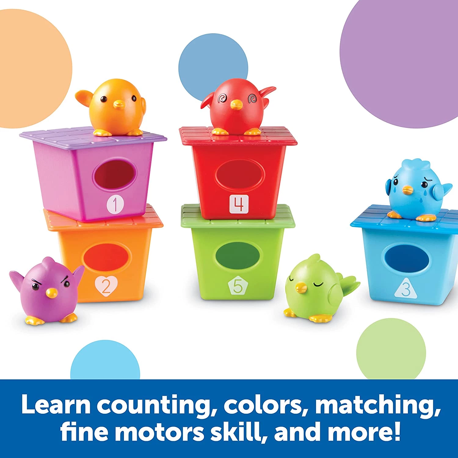Ці барвисті, кумедні пташки готові стати учасниками захопливого навчання! За допомогою представленого навчального набору діти познайомляться з кольорами, основами рахунку, навчаться зіставляти та сортувати предмети. Заняття відбуватимуться у веселій, невимушеній обстановці.