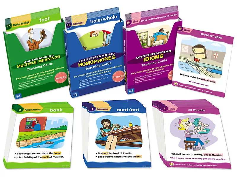 Ці навчальні картки дозволять легко зрозуміти складні слова і фрази: від «який» і «відьма» до «шматочка пирога»! Кожна ламінована карта має свою ідіому, омофона пара або багатозначне слово - з простими реченнями, які показують, як вона використовується в контексті, і підказкою для додаткового посилення. У наборі також є ідеї для занять!