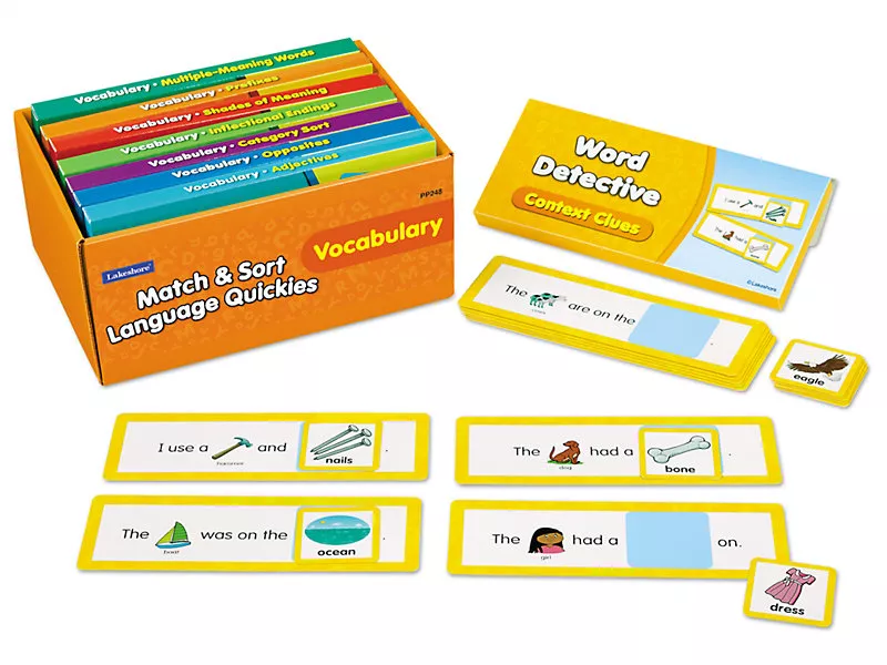 Покращуємо та розширюємо словниковий запас за короткий час! Цей набір включає в себе 8 різних карткових ігор, які фокусуються на важливих словникових поняттях - від багатозначних слів до протилежностей. Картки з яскравими картинками і словами на них.
