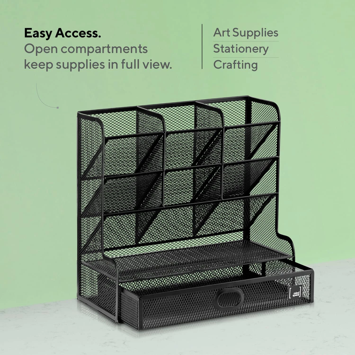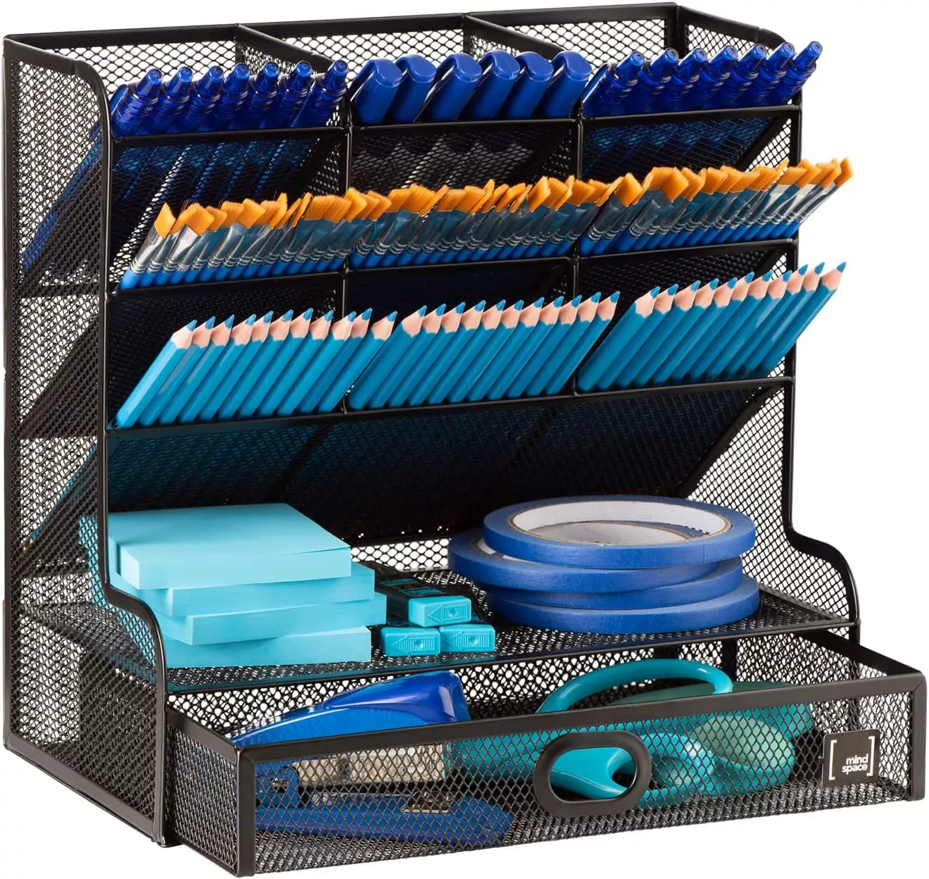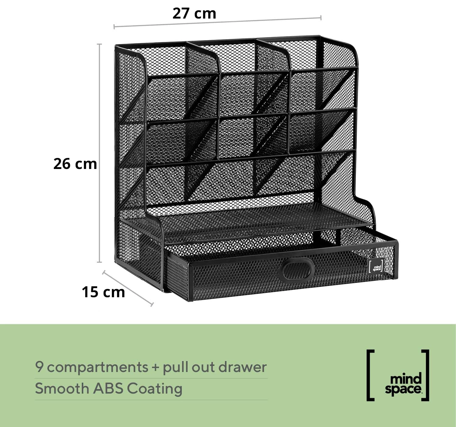 Цей місткий настільний органайзер, що складається з дев'яти відділень, є відмінним рішенням для зберігання ручок, олівців та іншого письмового приладдя та канцтоварів. Виріб виготовлено з легкої, але при цьому міцної сталевої сітки з гладкою поверхнею та порошковим покриттям. Міцний утримувач олівців прослужить вашій дитині не один рік.