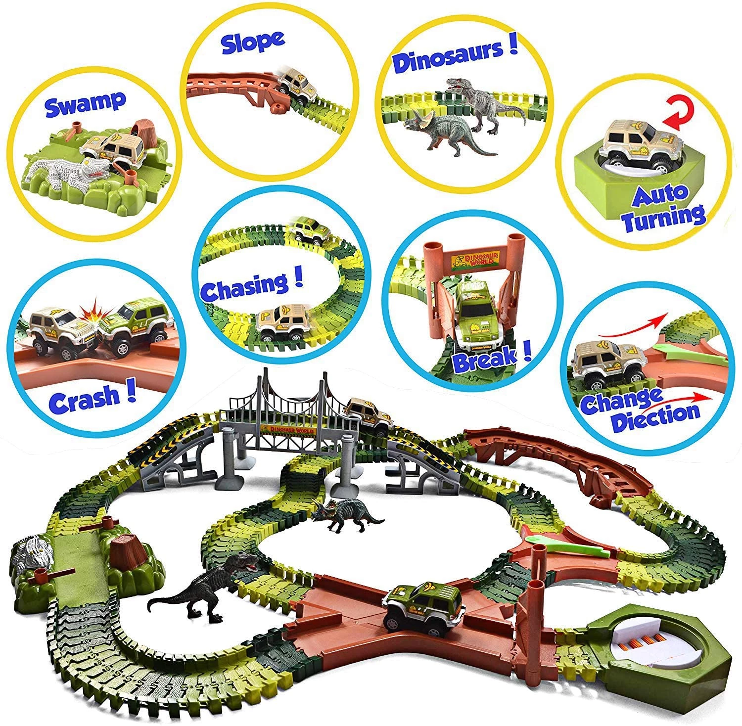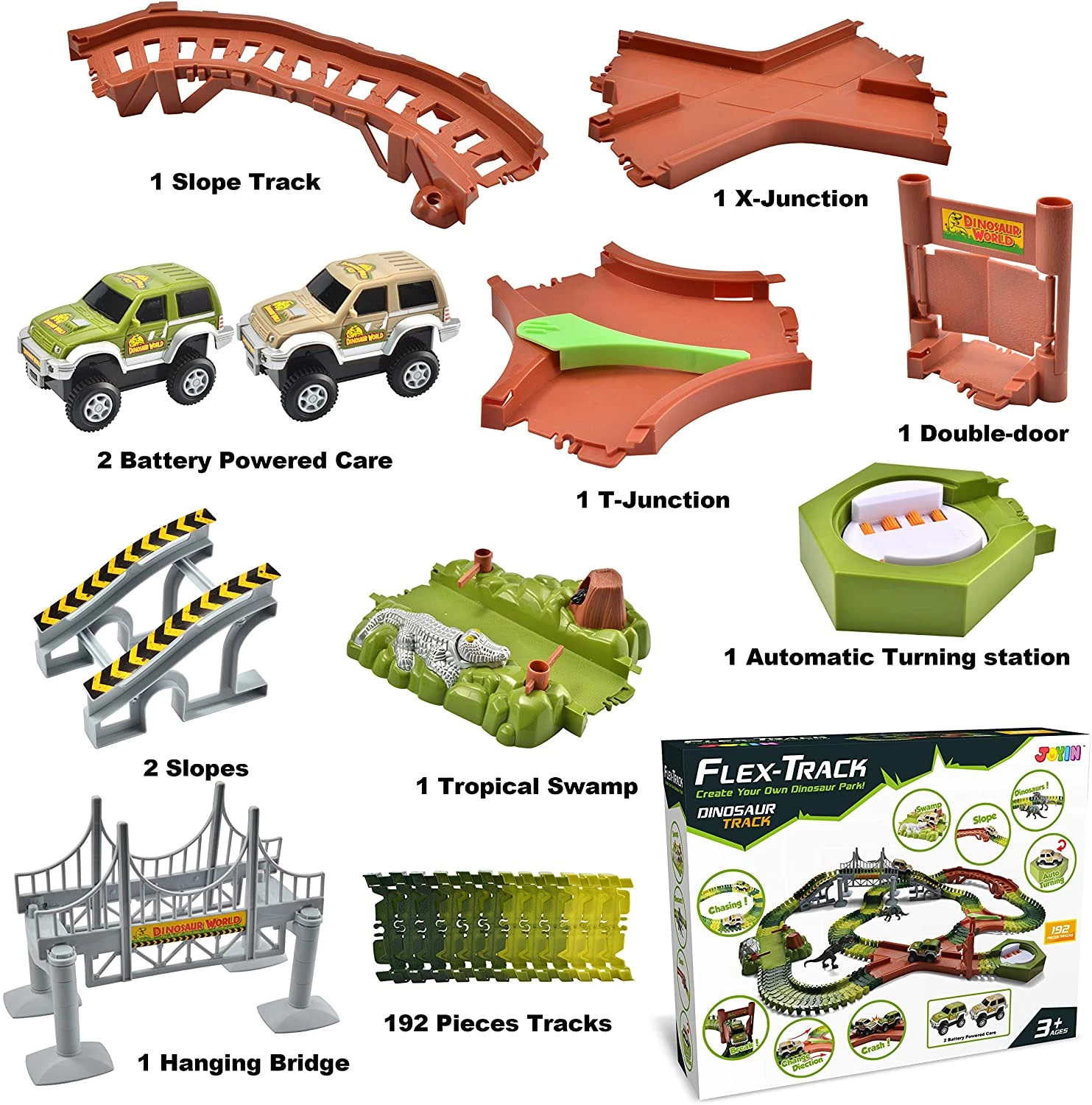 У наборі дитина знайде 2 динозавра, 2 гоночних автомобіля на батарейках, 1 х перехрестя, 1 перехрестя, 1 ворота, 1 висячий міст, 1 тропічне болото, 1 автоматична поворотна станція, і 192 деталі треків.