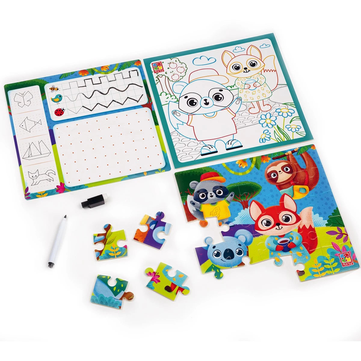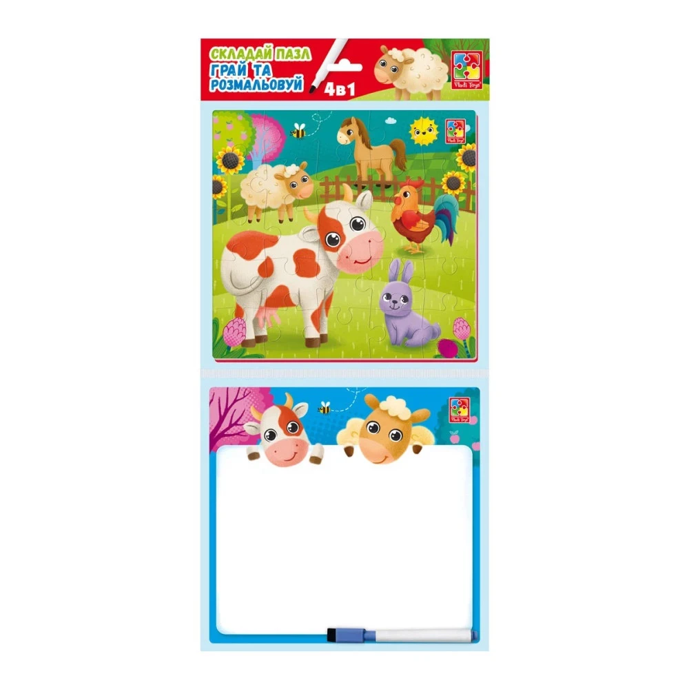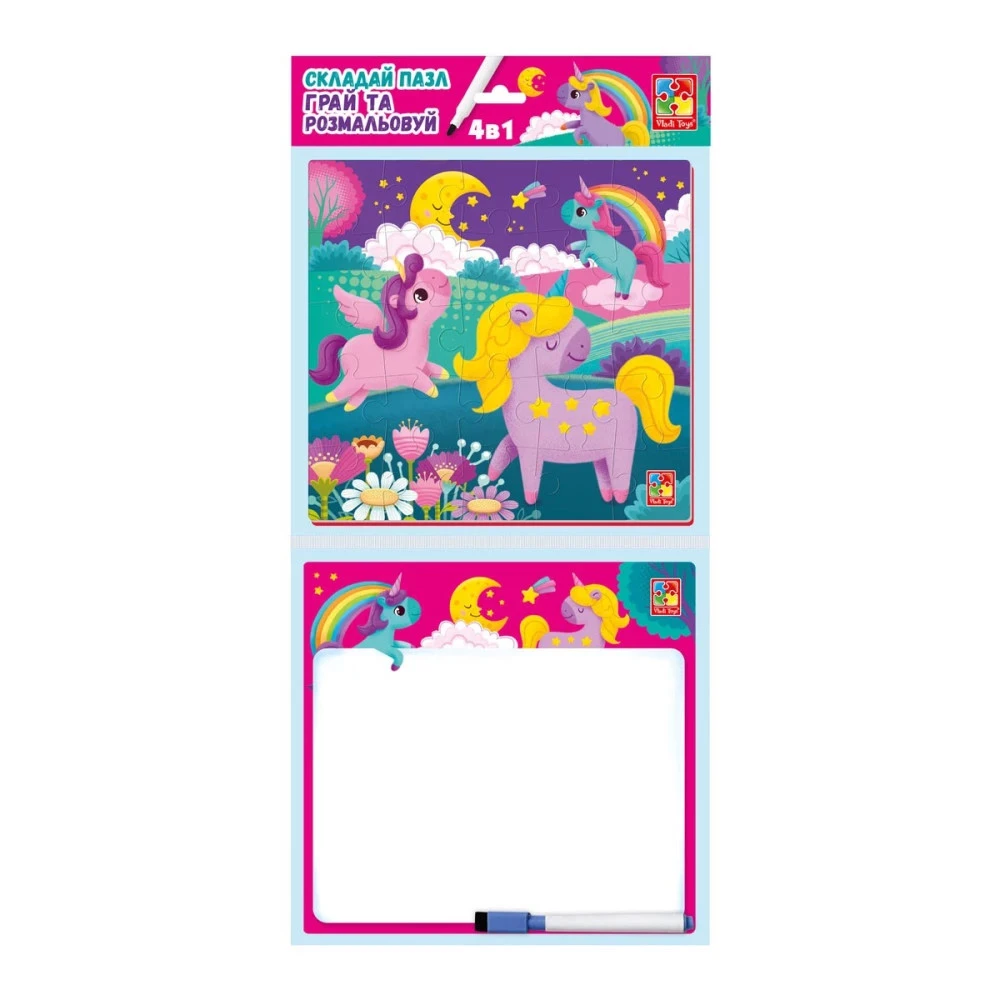 У процесі гри вам належить зібрати яскравий пазл. Також ви виконуватимете цікаві завдання. На звороті дошки можна писати або малювати, розвиваючи творчі здібності. Також набір включає розмальовку.