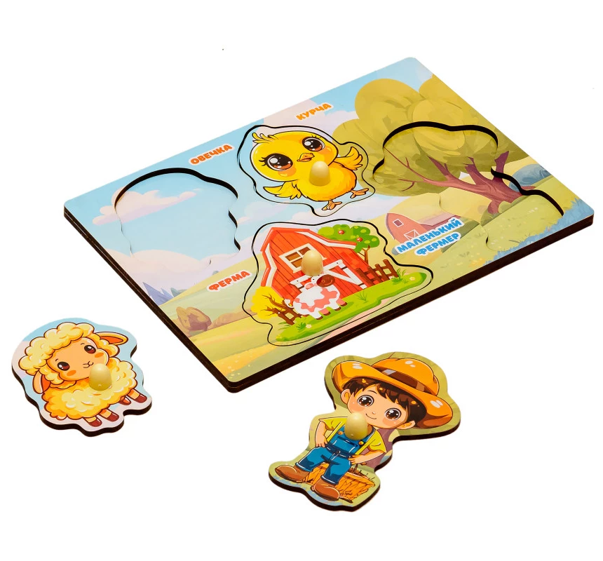 Іграшка складається з основи з поглибленнями у формі персонажів та декорацій ферми, а також фігурок веселого фермера, корівки, що стоїть поряд з хлівом, пухнастої овечки та жовтого курчата. Пазли оснащені зручними пластмасовими тримачами, що робить процес гри комфортним та безпечним.