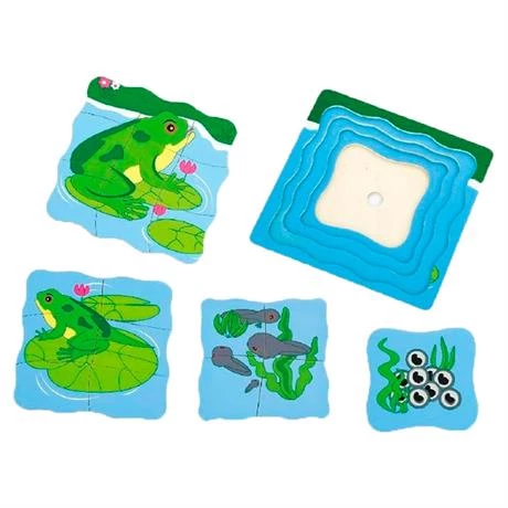 Багатошаровий незвичайний пазл знайомить дітей з основами біології. Коли дитина збирає пазл, вона під час гри бачить трансформацію ікринок в дорослу жабу. Деталі набору зроблені з дерева, края добре відшліфовані. Малюнок яскравий, зроблений безпечною для дітей фарбою.