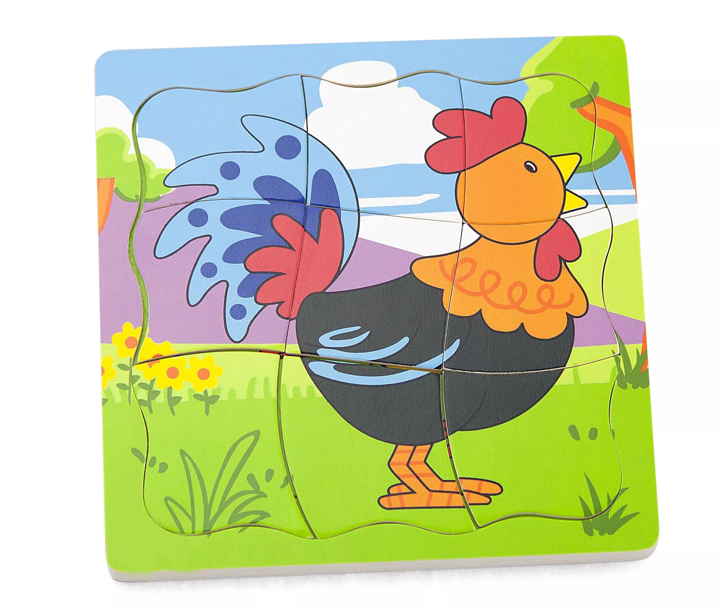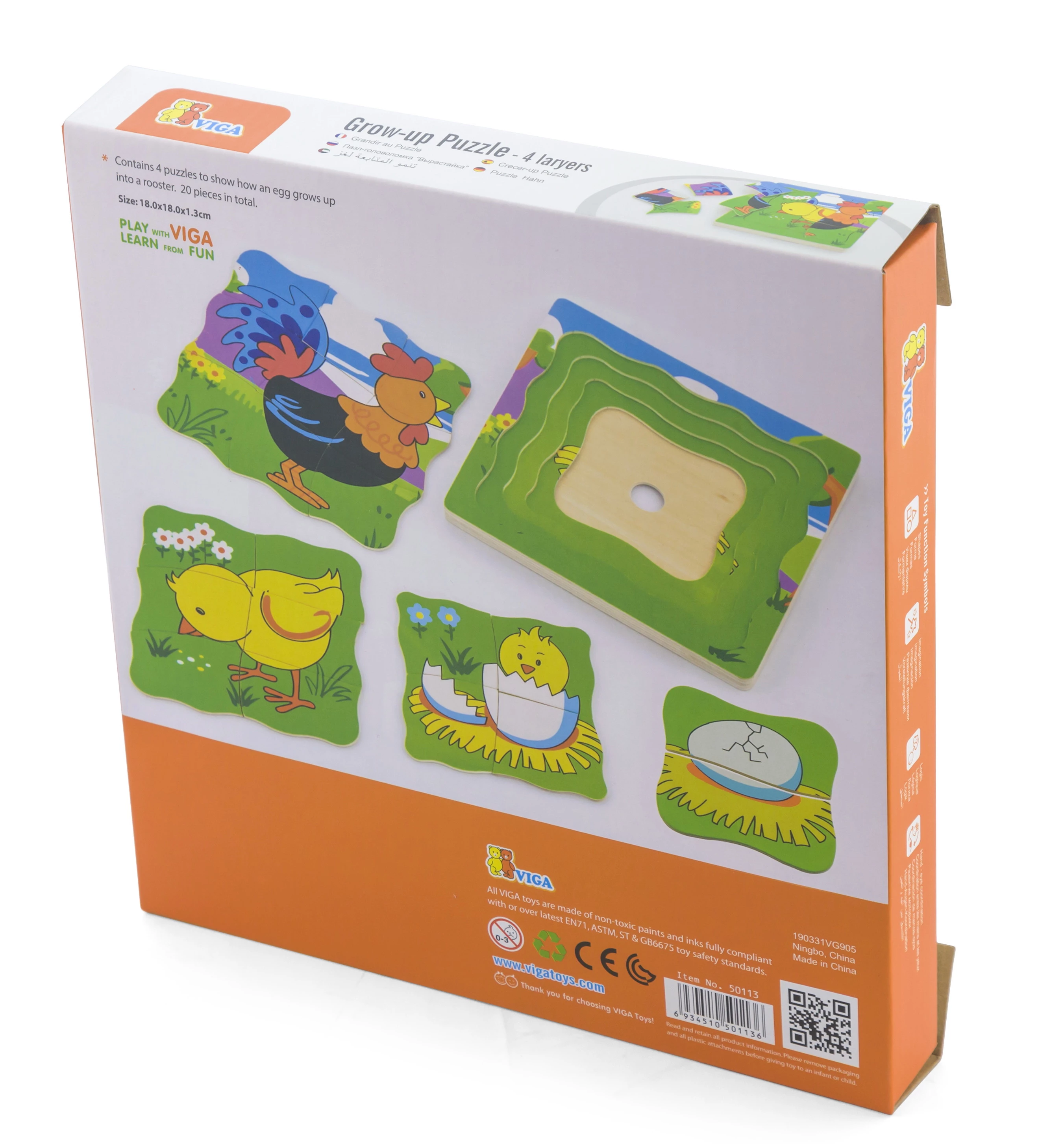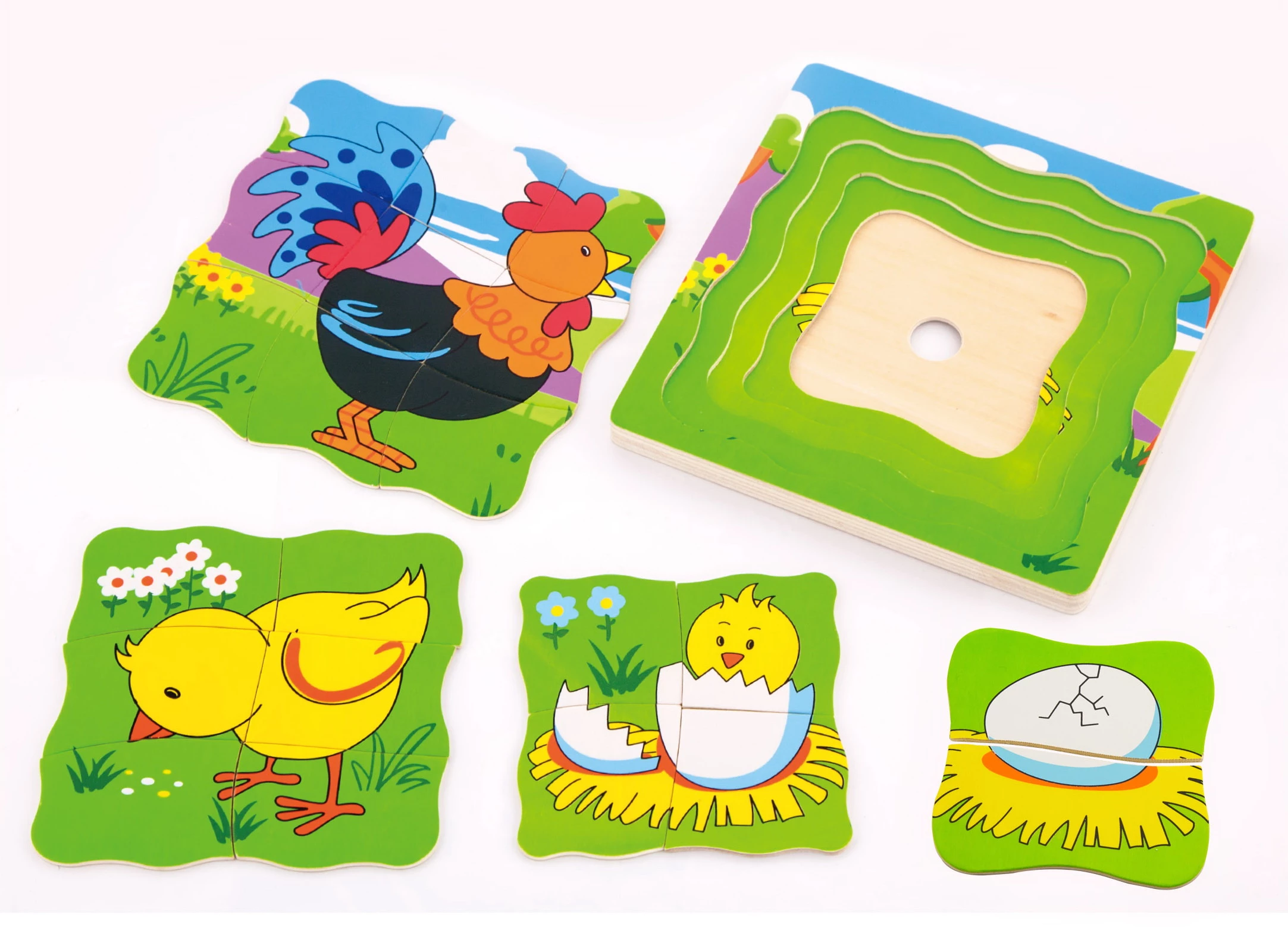 Захоплююча гра з пазлом, в якому малюк побачить трансформацію від яйця до півня. Пазл багатошаровий з 4 різними картинками. Під час гри, дитина бачить процес зародження і розвиток життя. Всі деталі з дерева, добре відшліфовані. Картинка на пазлі намальована безпечними для дітей фарбами.