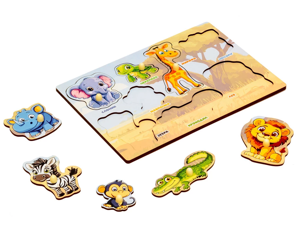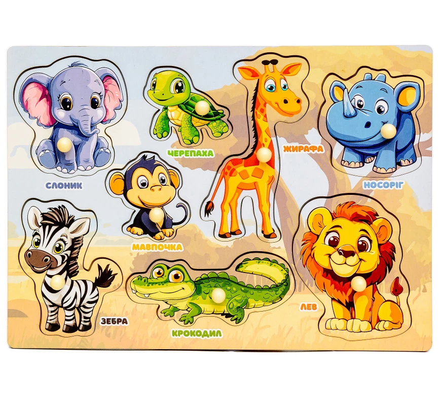 Пориньте у захопливий світ спекотної Африки з яскравим і пізнавальним пазлом-вкладишем, який називається «Африканські тварини». Набір включає вісім великих фігурок-вкладишів найвідоміших мешканців савани: слоненя, величного лева, жирафа, смугастої зебри, носорога, небезпечного крокодила, спритної мавпочки і черепашки.