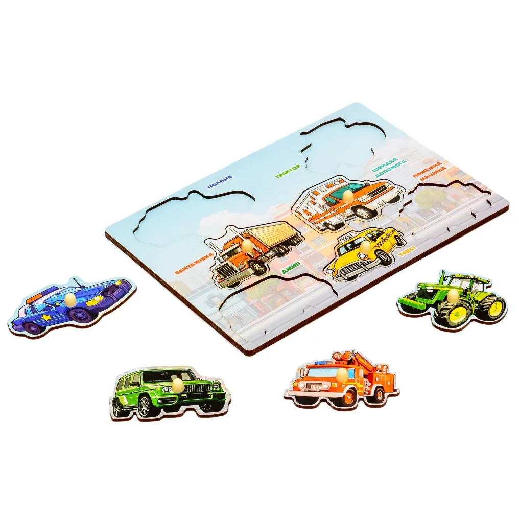Цей пазл стане чудовим подарунком для найменших автомобілістів. На ігровому полі з прорізами потрібно правильно розмістити різноманітні транспортні засоби. Набір включає 7 вкладишів, які мають зручну для маленьких дитячих ручок форму. Завдяки цьому малюкам буде зручно брати їх та розставляти на ігровому полі. Гра допомагає розвивати дрібну моторику, пам'ять та логічне мислення.