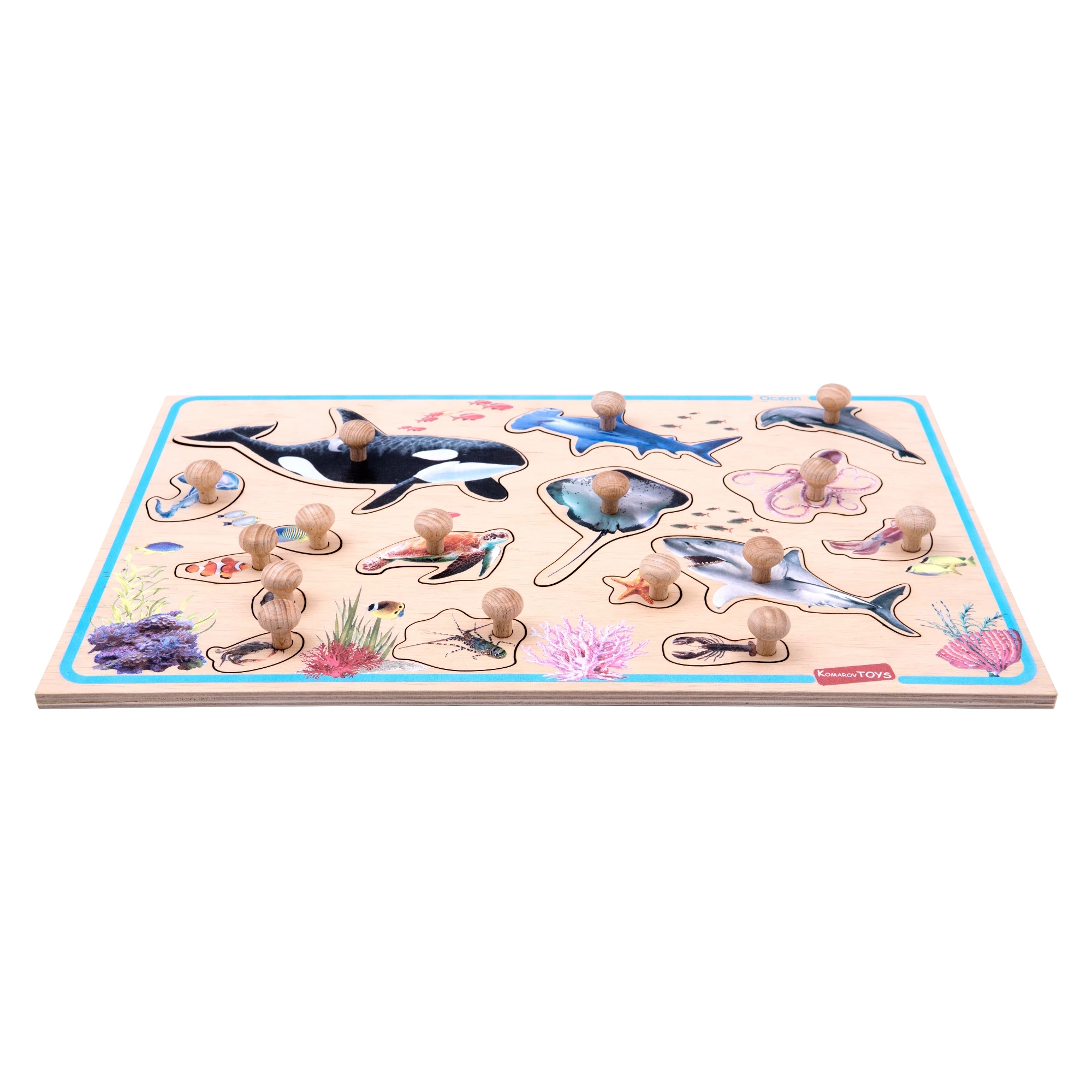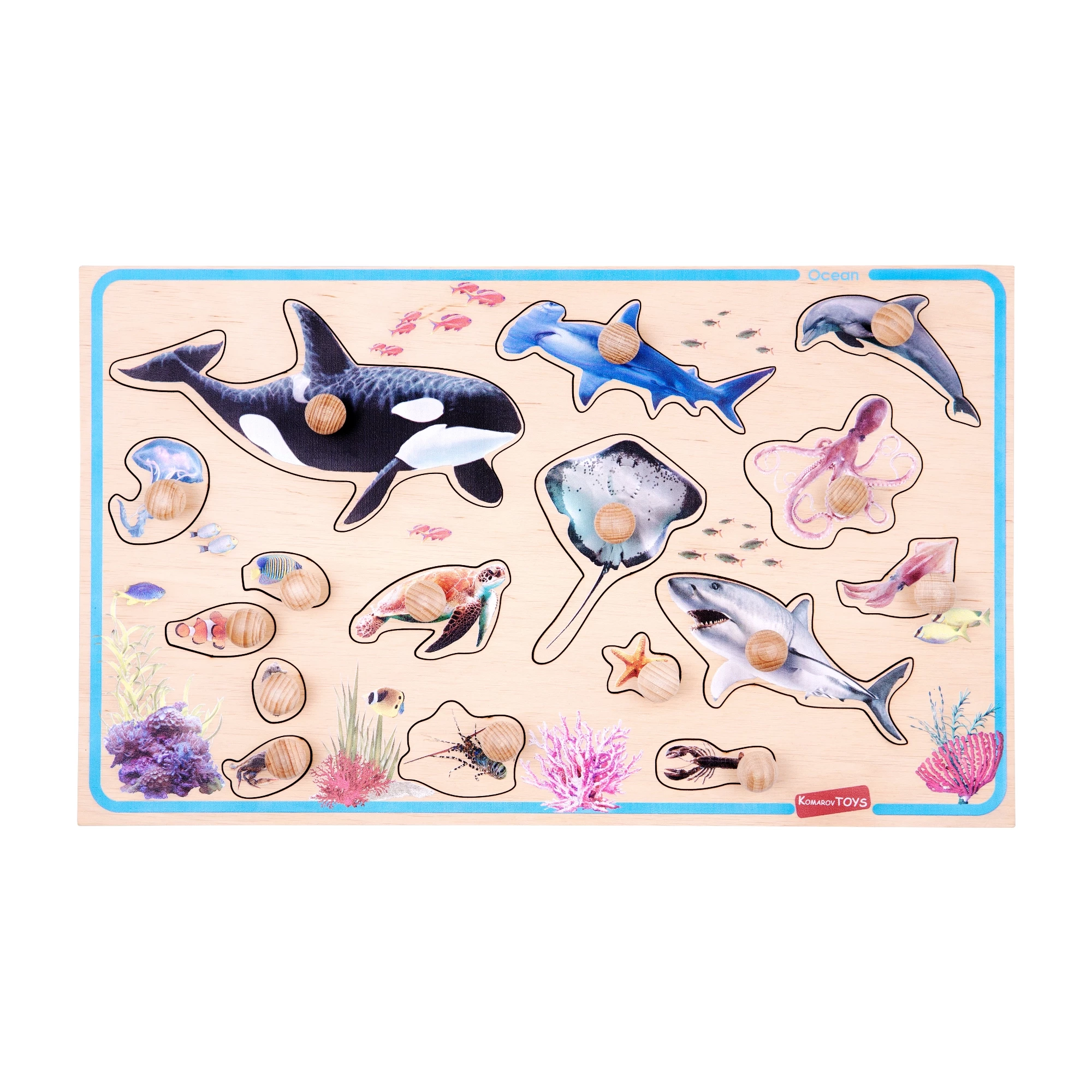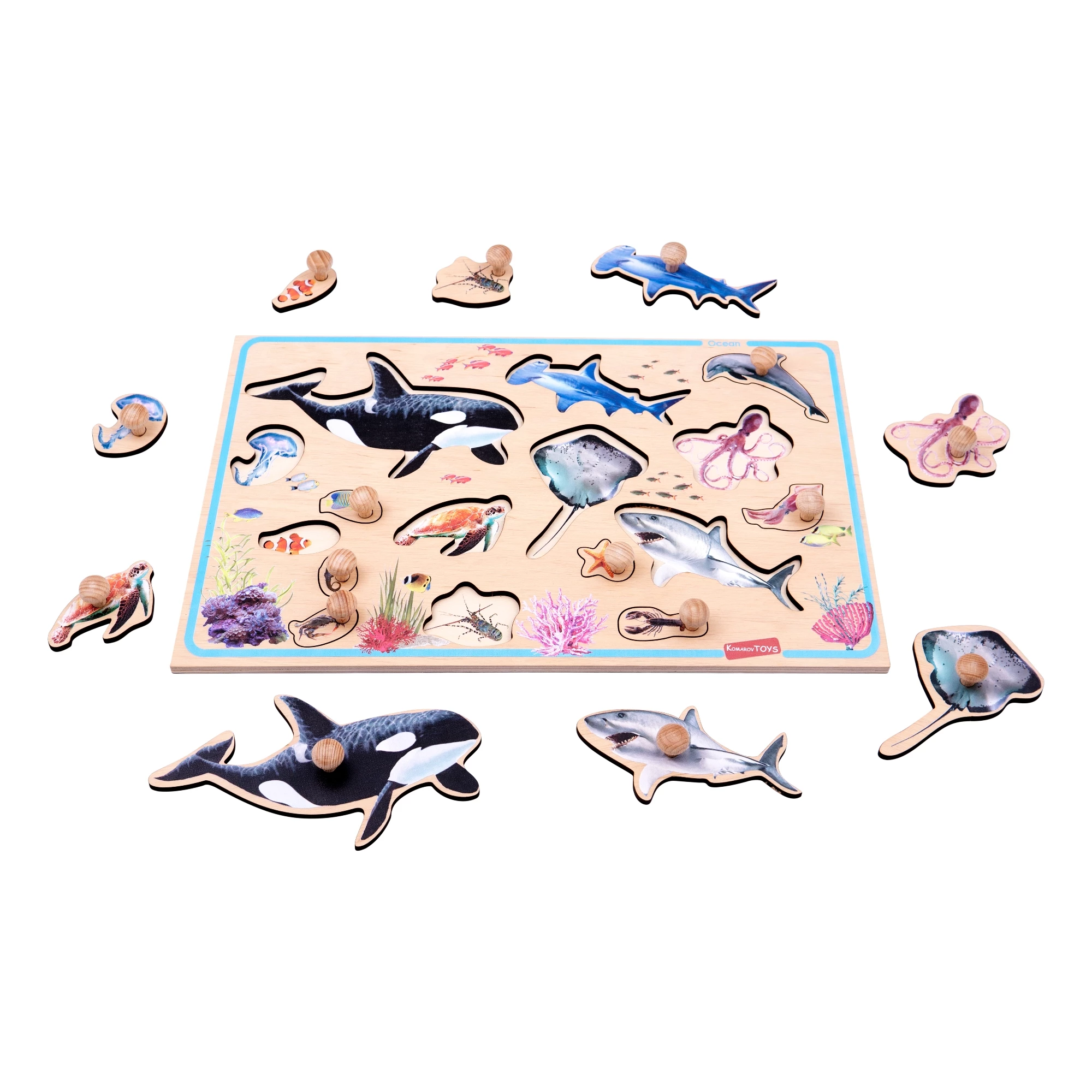Набір складається з основи та шістнадцяти елементів з реалістичним зображенням найбільш поширених тварин, що мешкають у морях та океанах. Кожен вкладиш має зручну ручку, деталі мають великий розмір та добре відшліфовані.