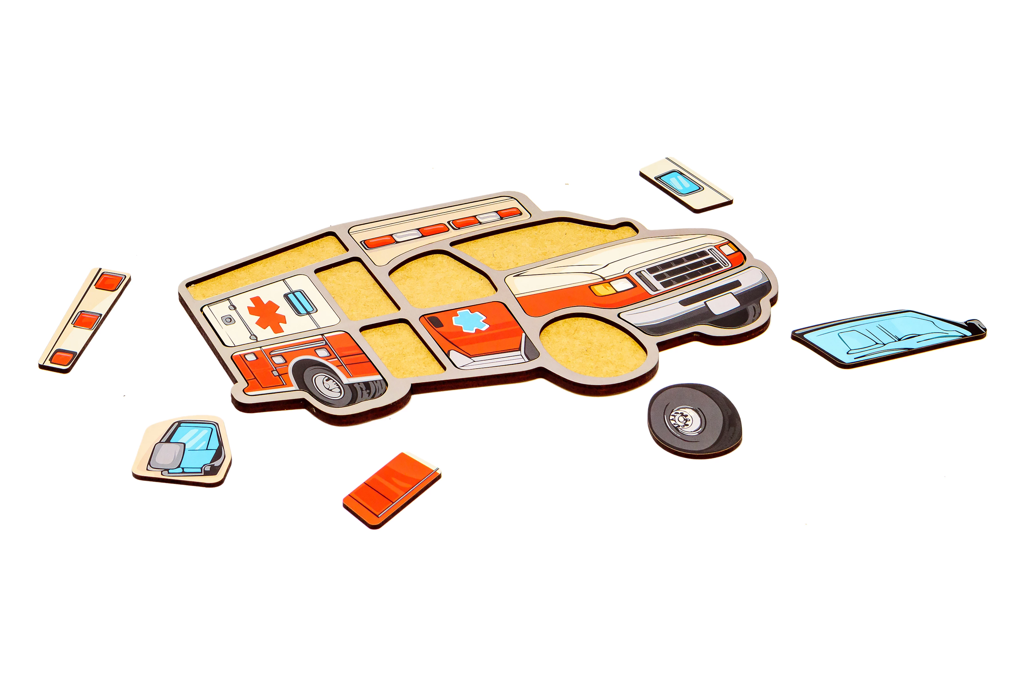 Цей пазл складається з рамки у формі швидкої допомоги, а також 12 деталей. Деталі яскраві, міцні, виготовлені із якісних матеріалів без шкідливих домішок. Гра з пазлом розвиває дрібну моторику, координацію, уважність та посидючість.