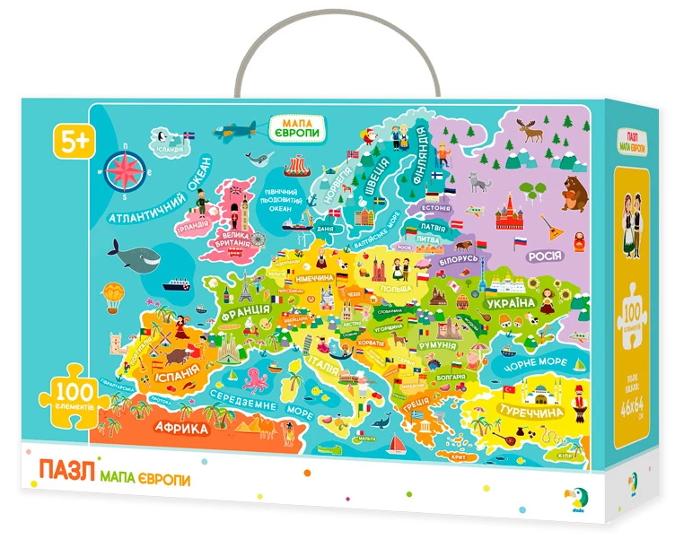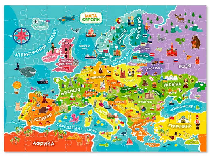 Пазли "Карта Європи" - прекрасний подарунок для Вашої дитини. Всього з сотні елементів можна зібрати яскраву карту з зображеннями особливостей, прапорами і найпопулярнішими пам'ятками кожної з країн Європи. Пазли добре розважать дитину, допоможуть йому в вивченні географії, а також стануть відмінним і корисним прикрасою для стіни. Крім того, це чудове заняття для розвитку дитини, а також непоганий спосіб захоплююче провести вечір з родиною.