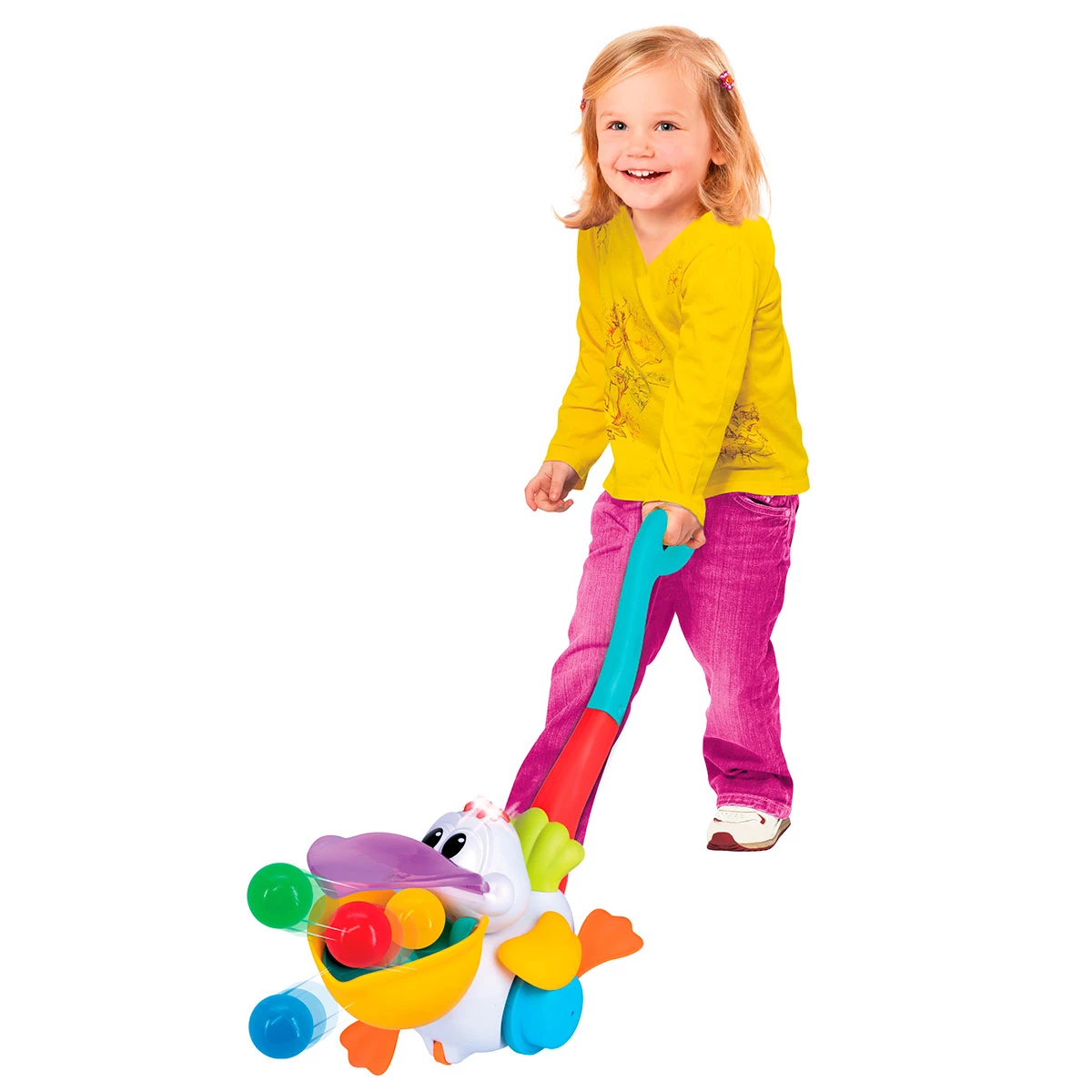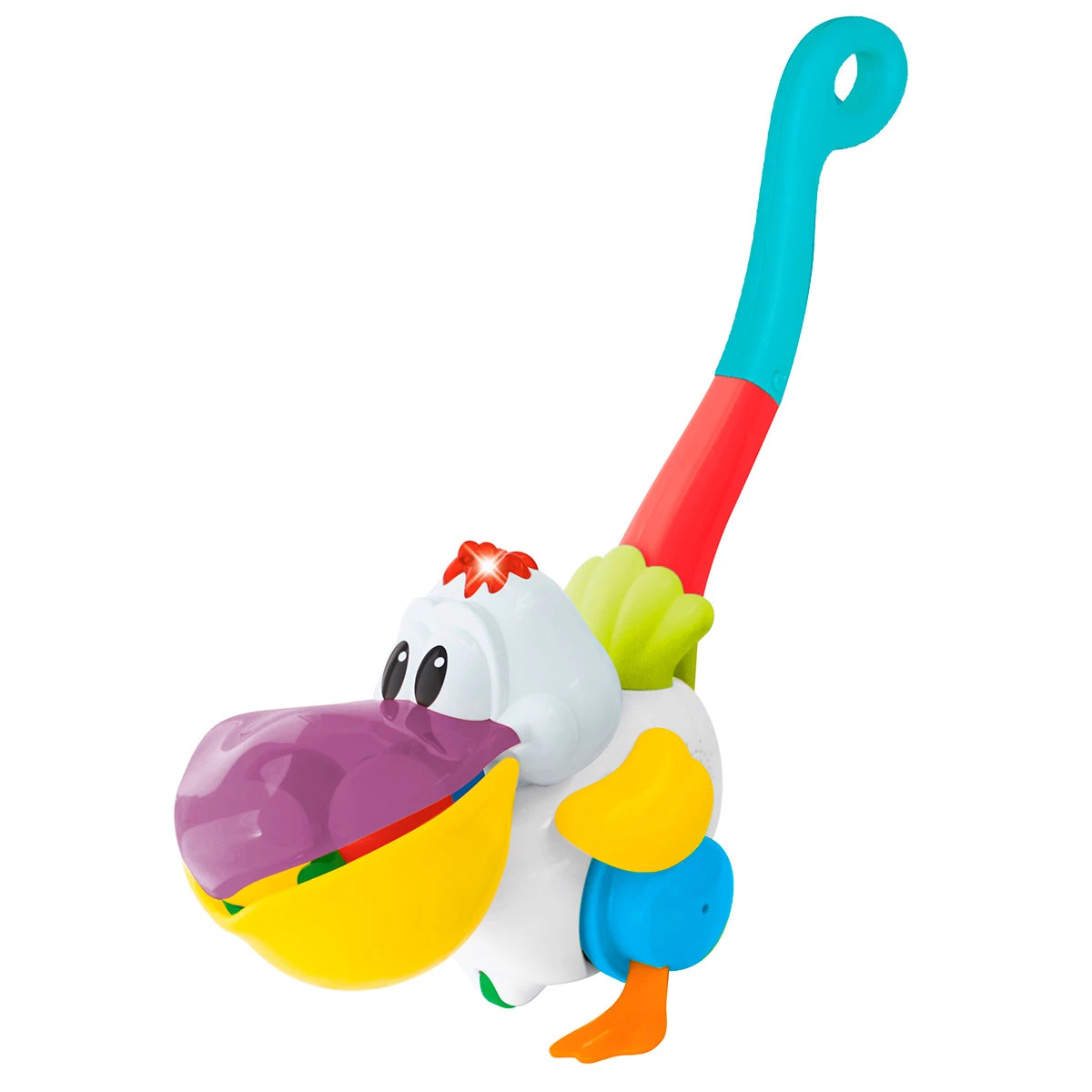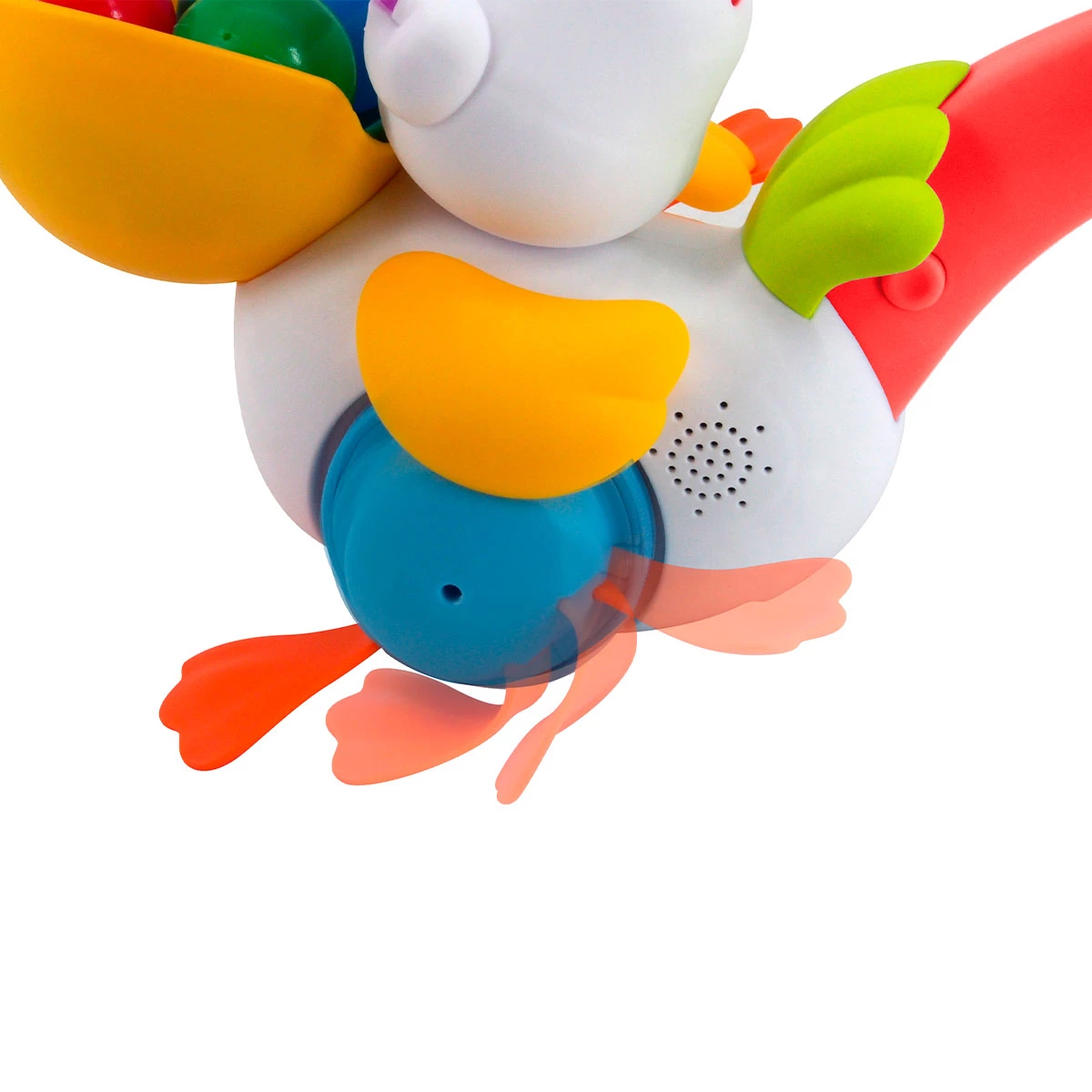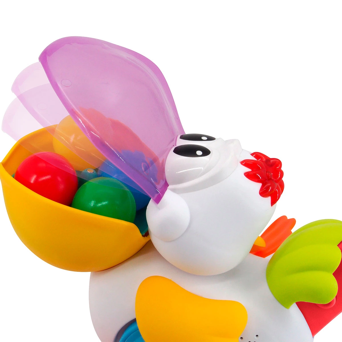 Покладіть у дзьоб пелікану 4 кулі, які поставляються в наборі. Якщо каталка рухатиметься вперед, вони будуть випадати з дзьоба, а малюк повинен буде їх зібрати. Пташині лапки крутяться разом із шестернями. Крила рухаються верх і вниз, а гребінець на голові світиться. Каталка може рухатися у будь-якому напрямку. Ігровий процес супроводжують веселі пісні та смішна лічилочка.