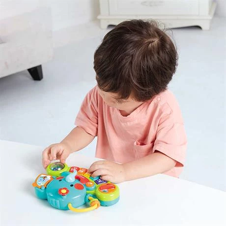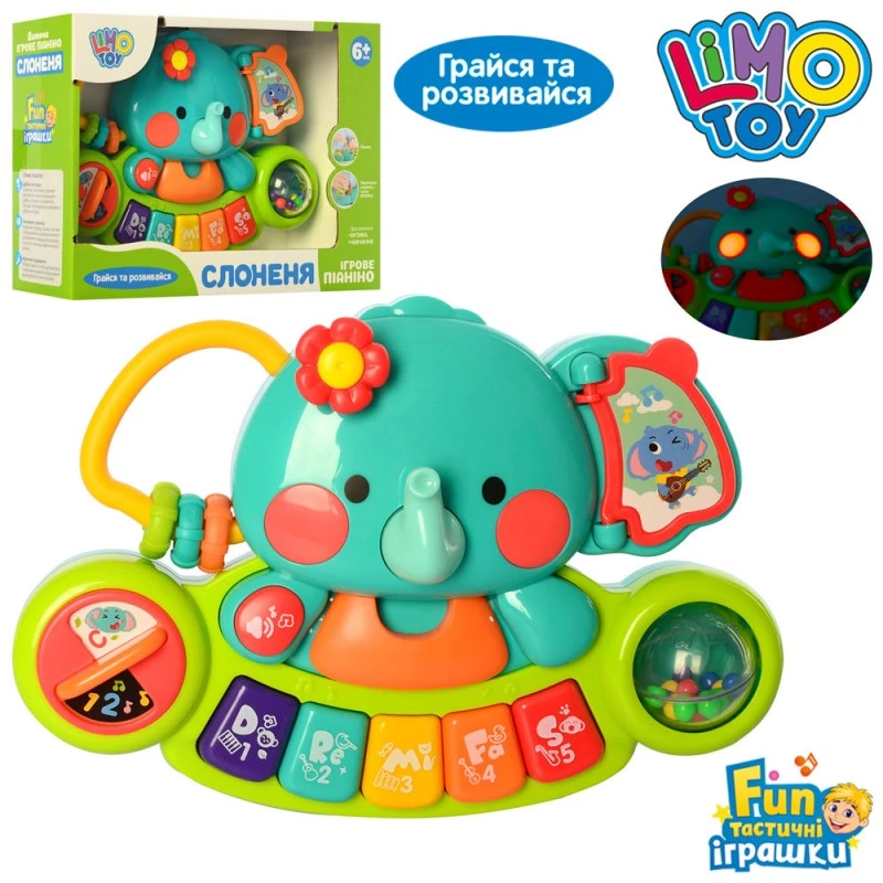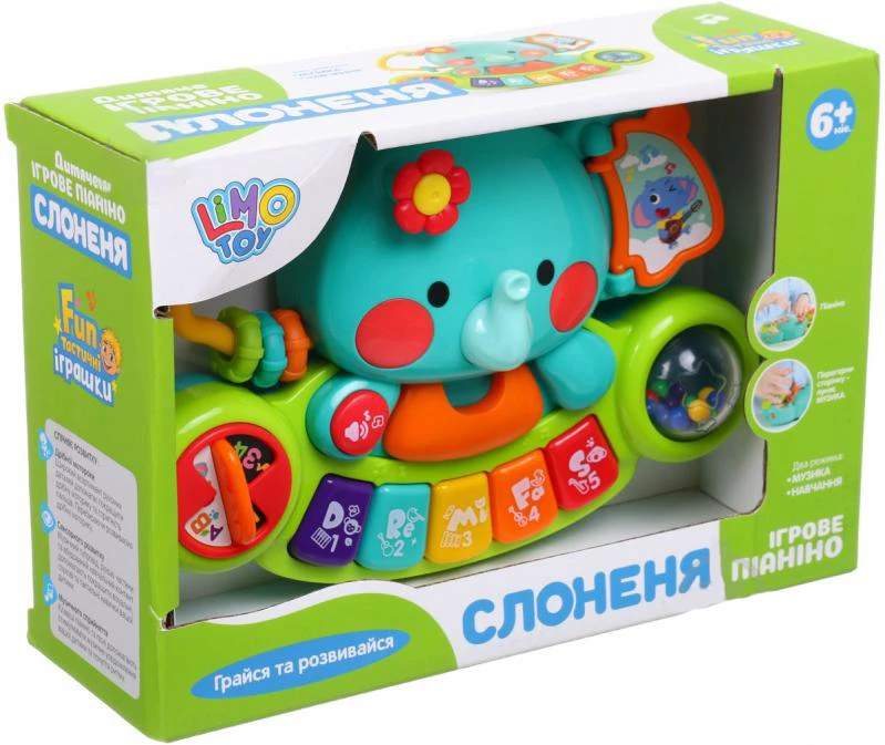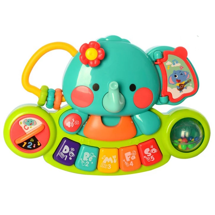 Захоплююча музична іграшка піаніно у вигляді слоника з п'ятьма різнокольоровими клавішами. А ще є кільця, міні книжка з картинками, брязкальце з кульками, крутилка, миготливі лампочки і кнопка гучності. Натискаючи на клавіші малюк чує смішні звуки, мелодії та звуки тварин.