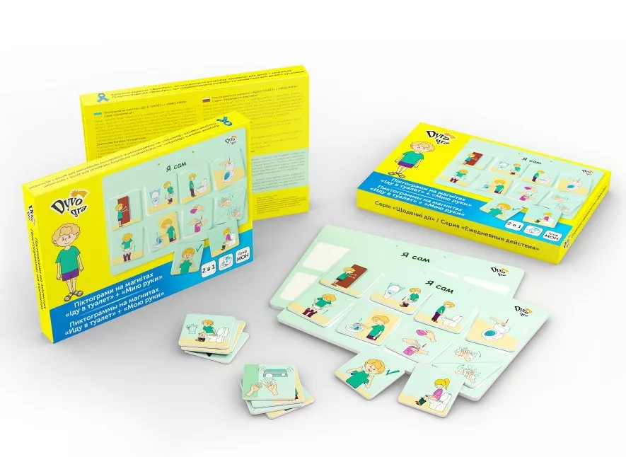 Цей набір магнітів підійде для формування і закріплення соціально-побутових і гігієнічних навичок дітей від 2 до 6 років. Він розроблений з урахуванням особливостей візуального сприйняття дітей з розладами аутистичного спектру (РАС), порушеннями інтелектуального та мовленнєвого розвитку. Отже, кожна дитина з особливими освітніми потребами матиме можливість самостійно контролювати виконання власних рутинних дій. Найбільш часто його практикують з дітьми, які мають особливості розвитку, саме тому його зовнішній вигляд найбільш адаптований під їх сприйняття. Орієнтуючись по спеціальним магнітам, діти швидко засвоюють послідовність дій походу в туалет і миття рук після, вони перетворюються в звичку. Всі деталі комплекту можна мити чи витирати вологою серветкою і дезінфікувати. У комплекті йдуть планшети для кріплення магнітів, і дитина зможе самостійно розташовувати магніти в правильному порядку виконання дій.
