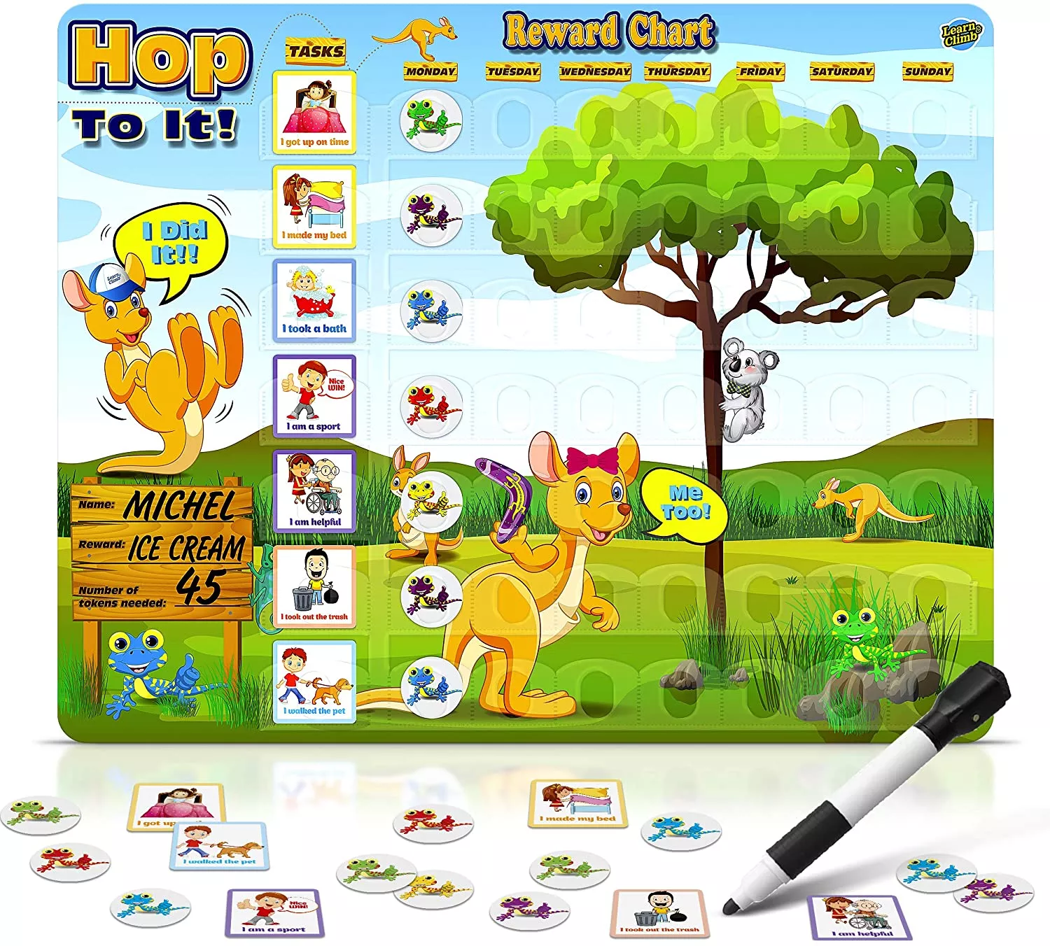 Є маркер для сухого стирання, щоб написати ім'я дитини на планері, і скільки жетонів він зібрав за тиждень.