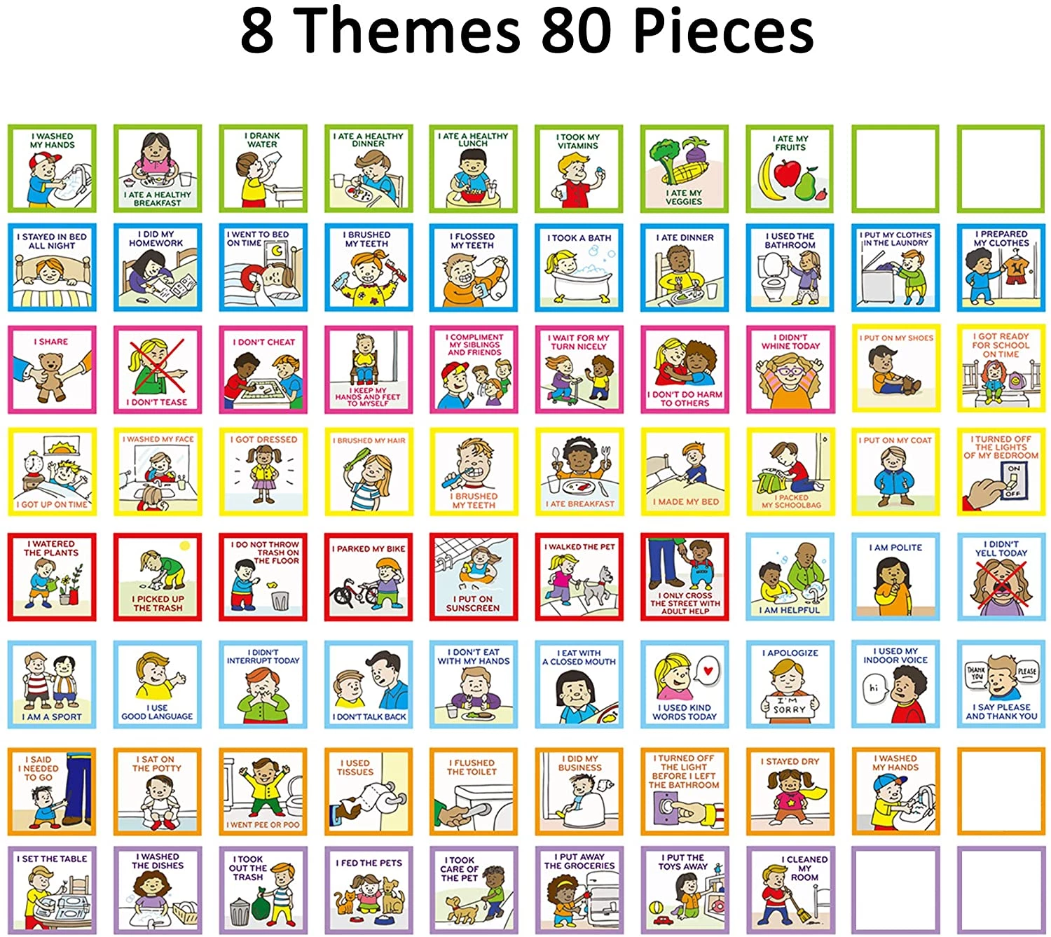 У наборі 75 щоденних обов'язків, включаючи хороші манери, здорове харчування, домашні справи, ранкові ритуали, прогулянки, соціальні обов'язки, і вечірні ритуали.