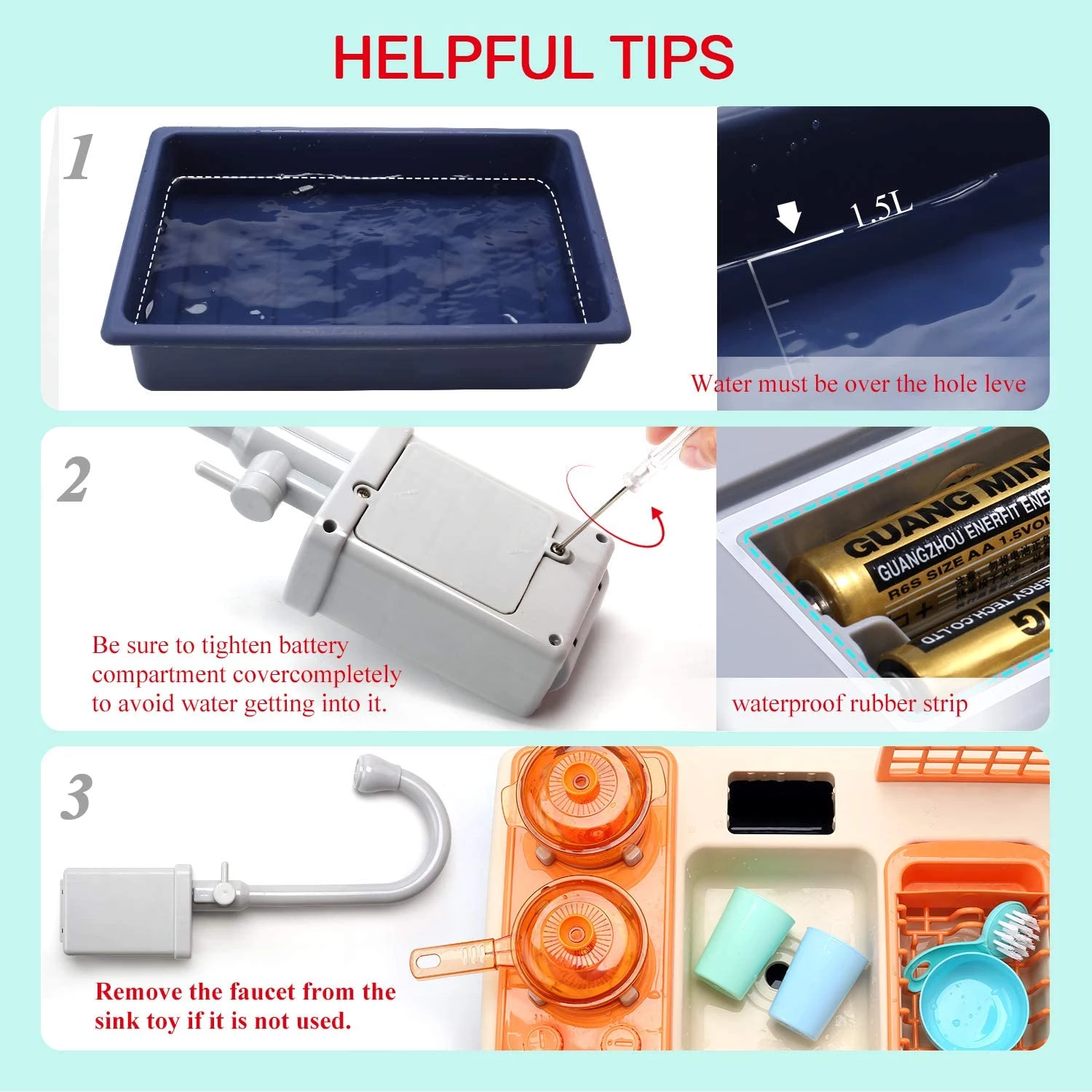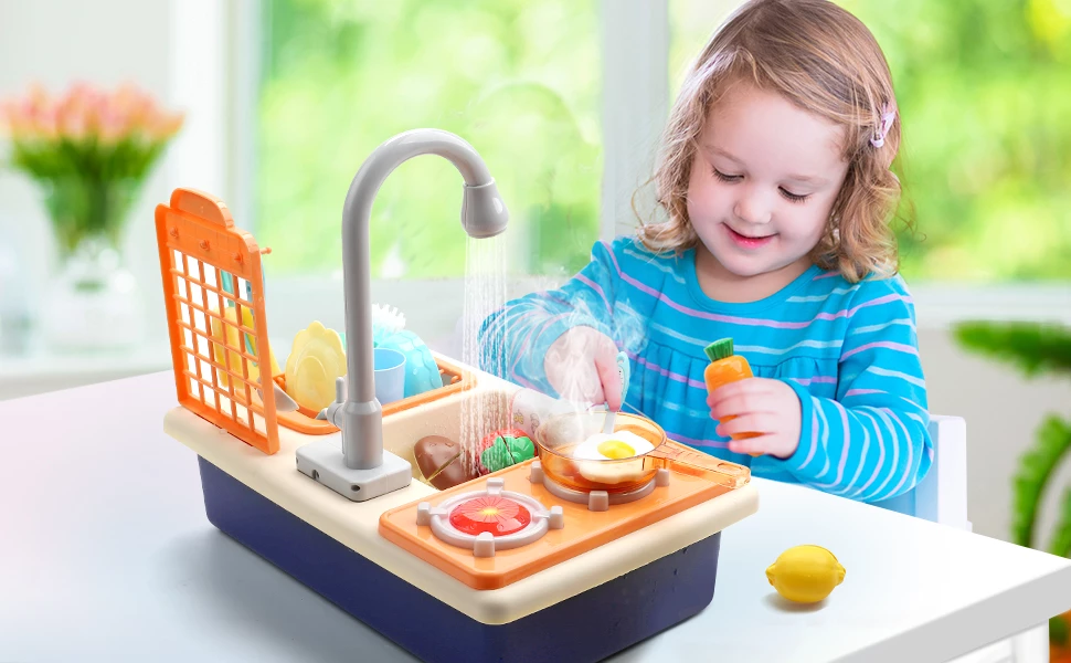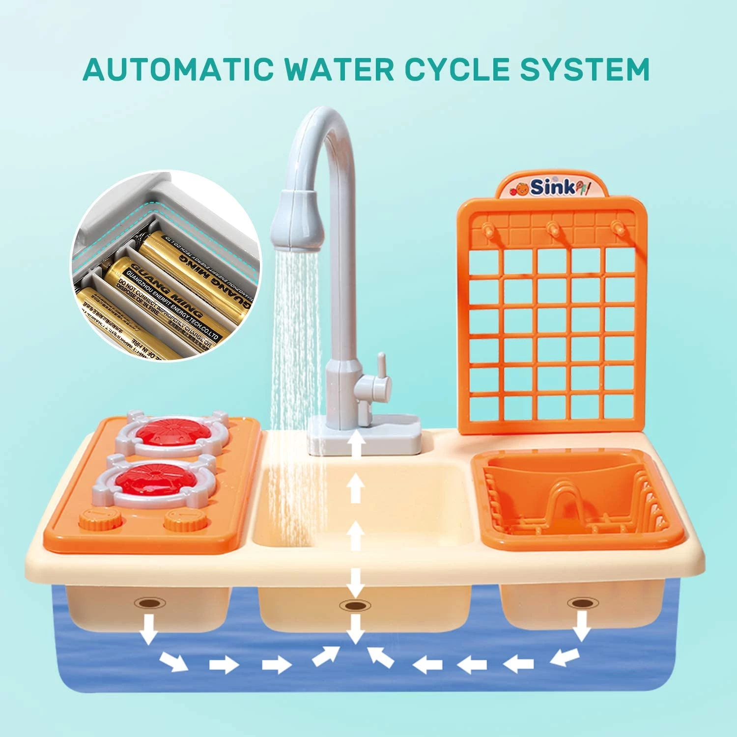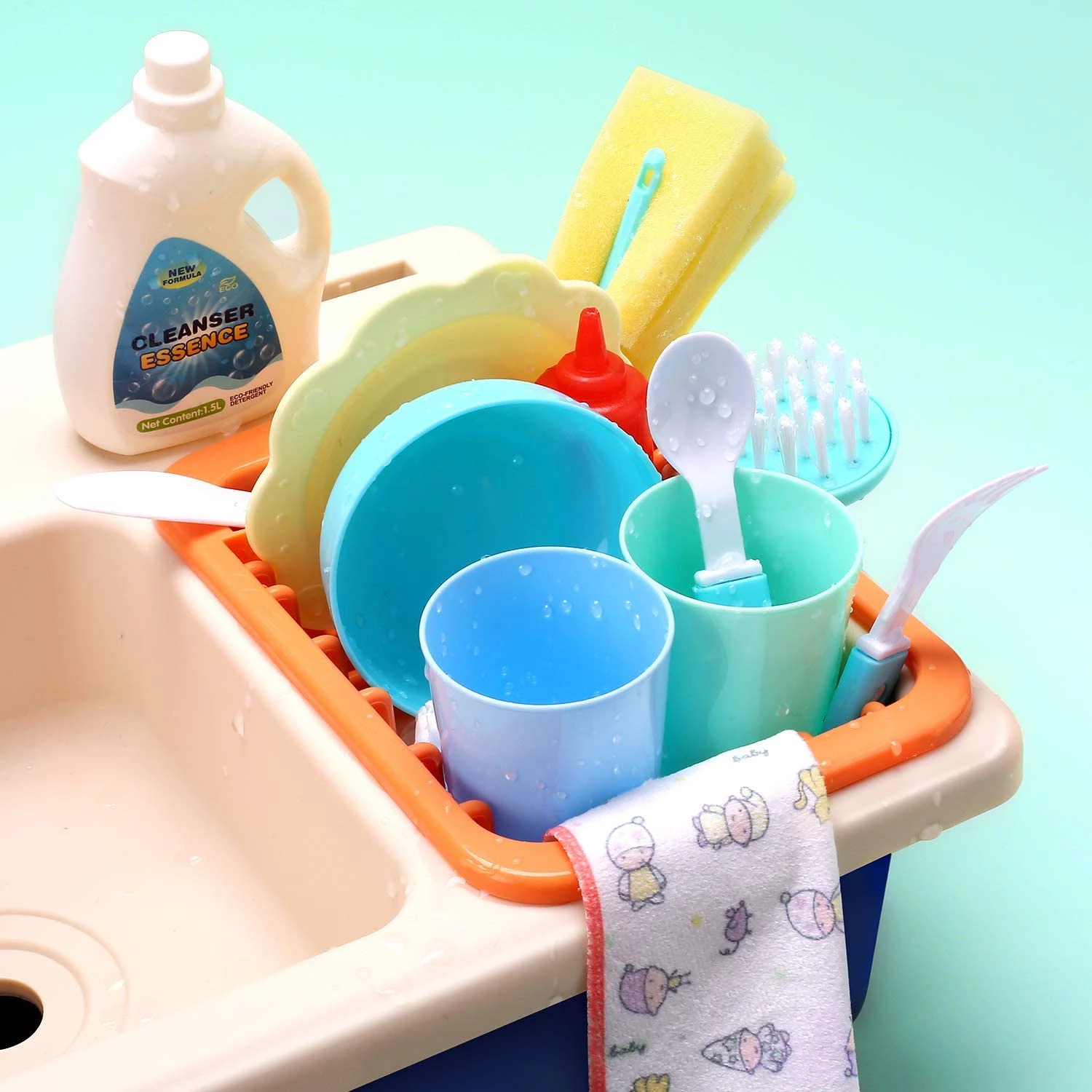 CUTE STONE Pretend Play Kitchen Sink Toys with Play Cooking Stove, Pot and Pan with Spray Realistic Light