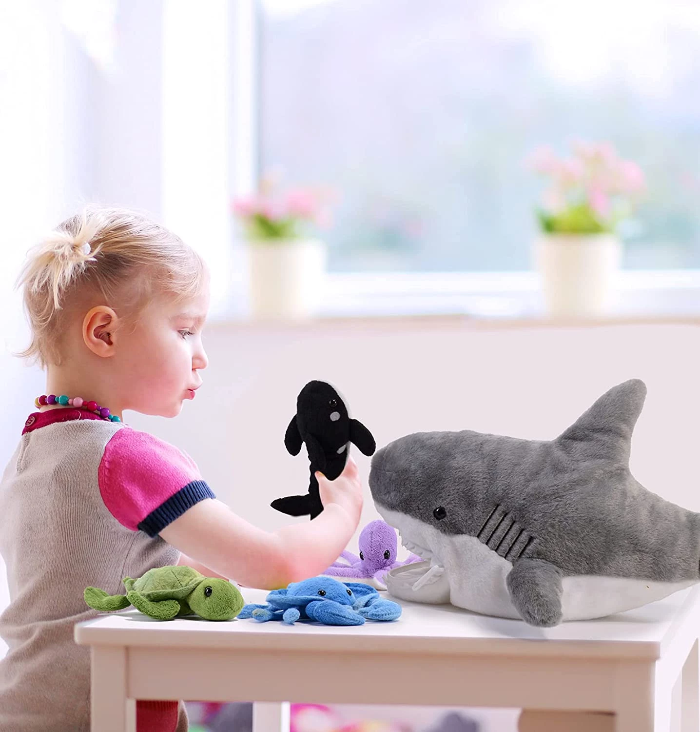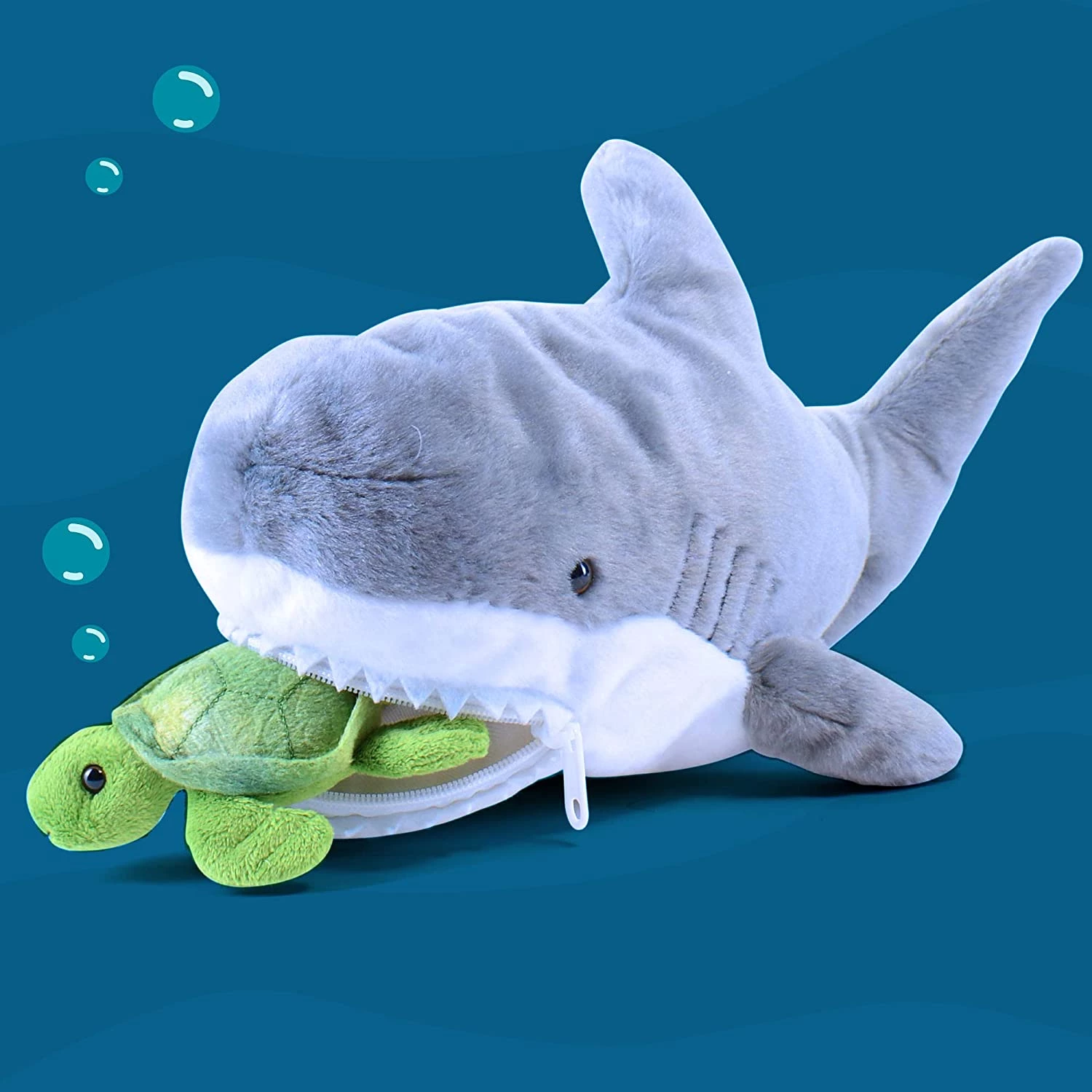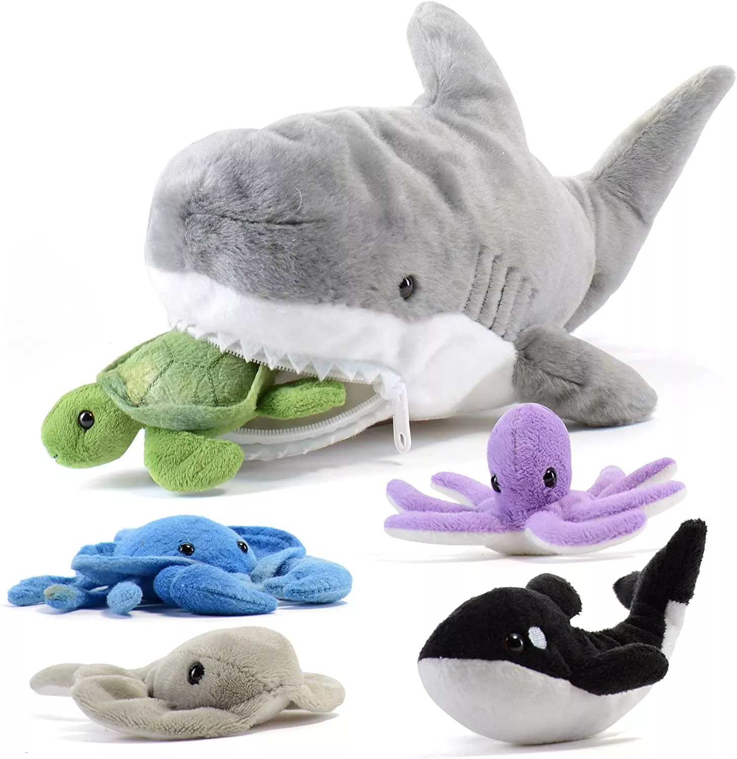 Цікавий набір плюшевих морських мешканців прекрасно підійде в якості подарунка на будь-яке свято. У велику акулу втрутяться іграшки поменше: скат, восьминіг, косатка, краб і черепаха. На щелепах знаходиться замок-блискавка, тому фігурки не випадуть. Набір зручно зберігати всередині однієї іграшки, дитина завжди зможе взяти його з собою. Для виготовлення використовувалися тільки якісні та безпечні матеріали.