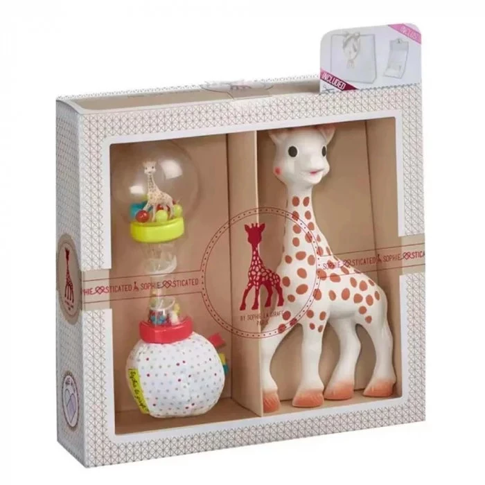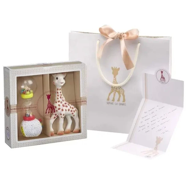 Подарунковий набір від відомого бренду Vulli – чудовий презент дбайливих батьків новонародженому. У комплект входить легендарна іграшка-прорізувач «Жирафа Софі», брязкальце-маракас, подарунковий пакет та листівка. Іграшки, що входять до представленого набору, дозволять новонародженим розвиватися вже з перших місяців життя! Брязкальце має ергономічні для маленьких дитячих ручок розміри. Матеріали, з яких виконані іграшки, приємні на дотик.