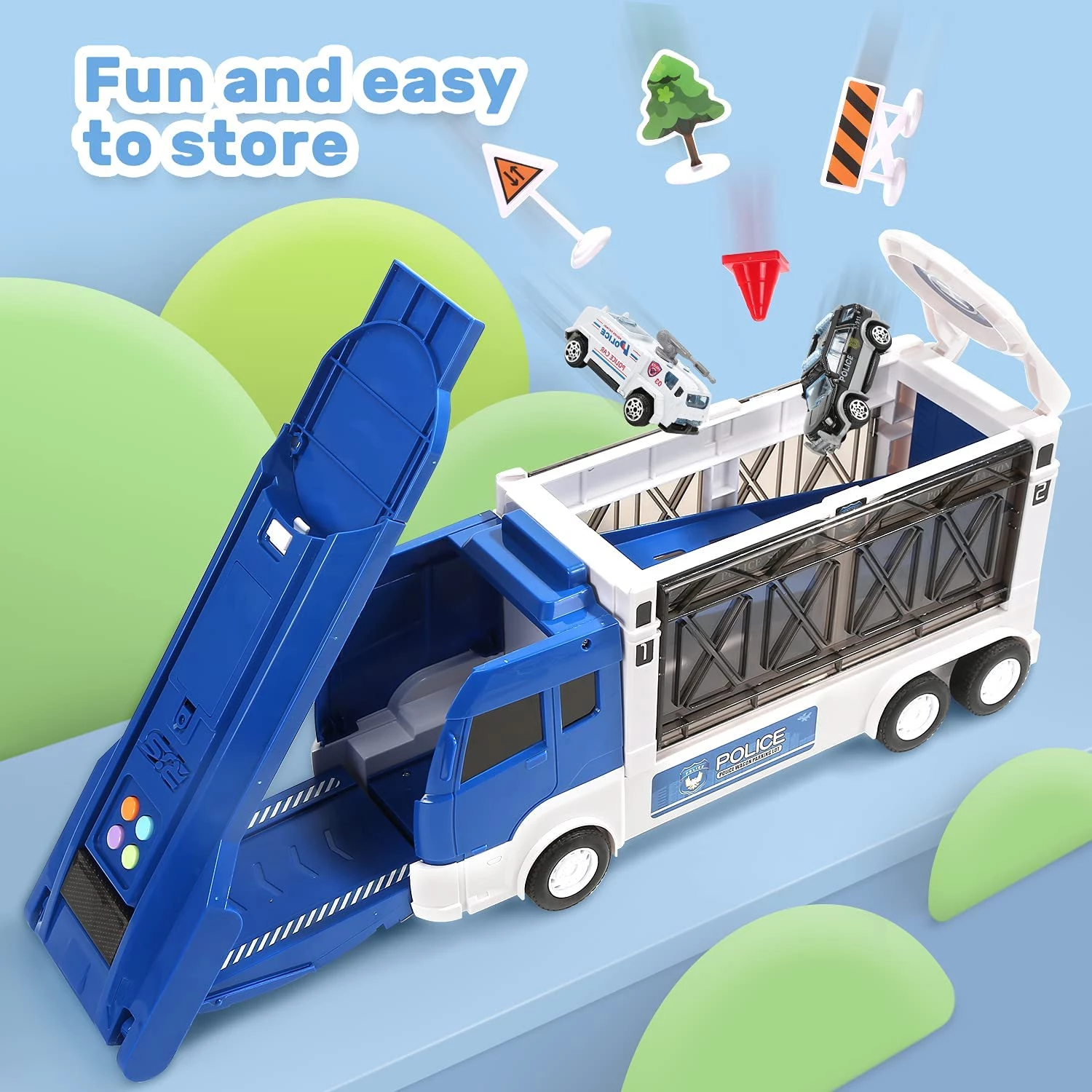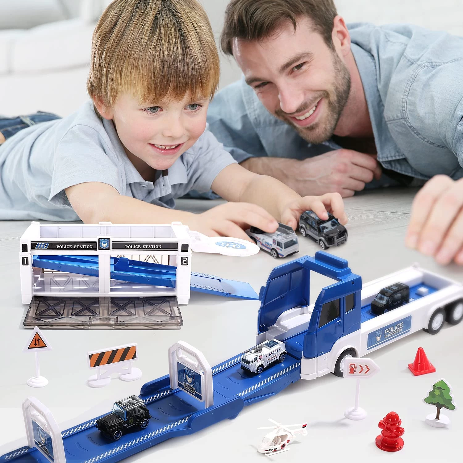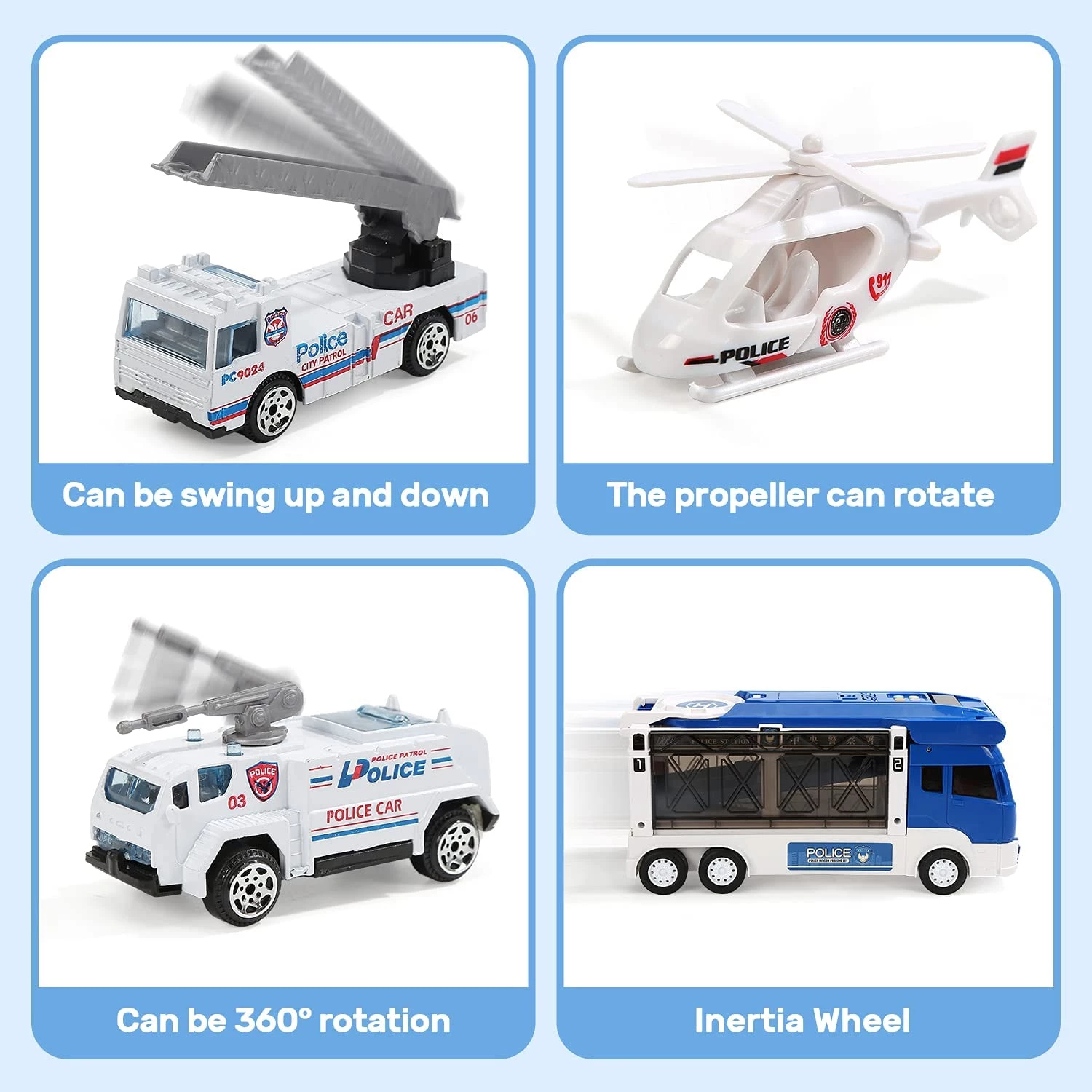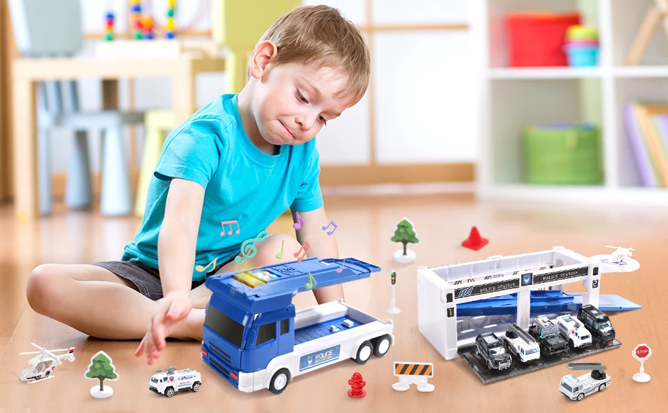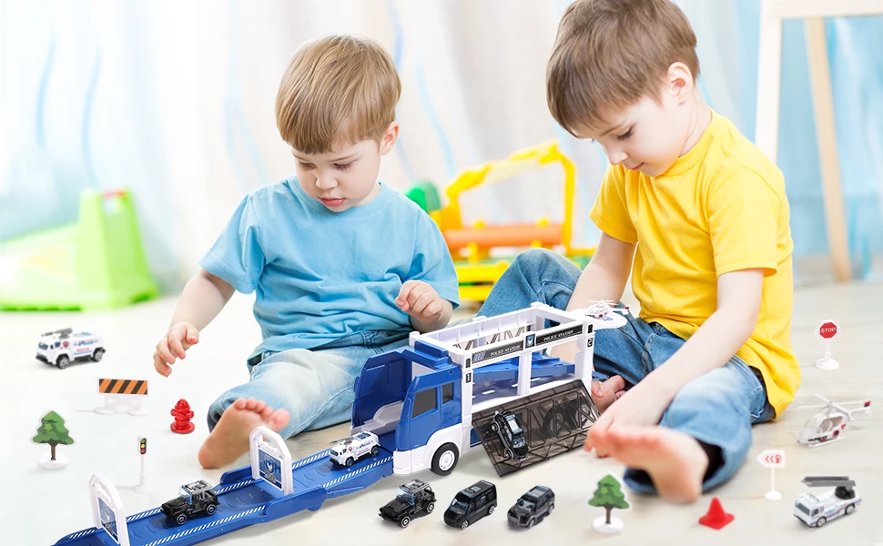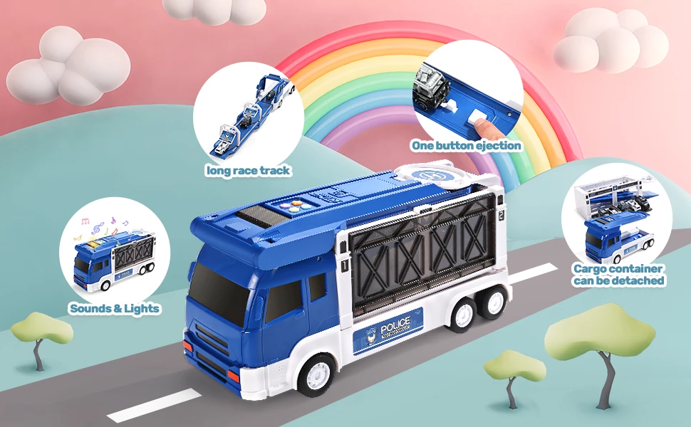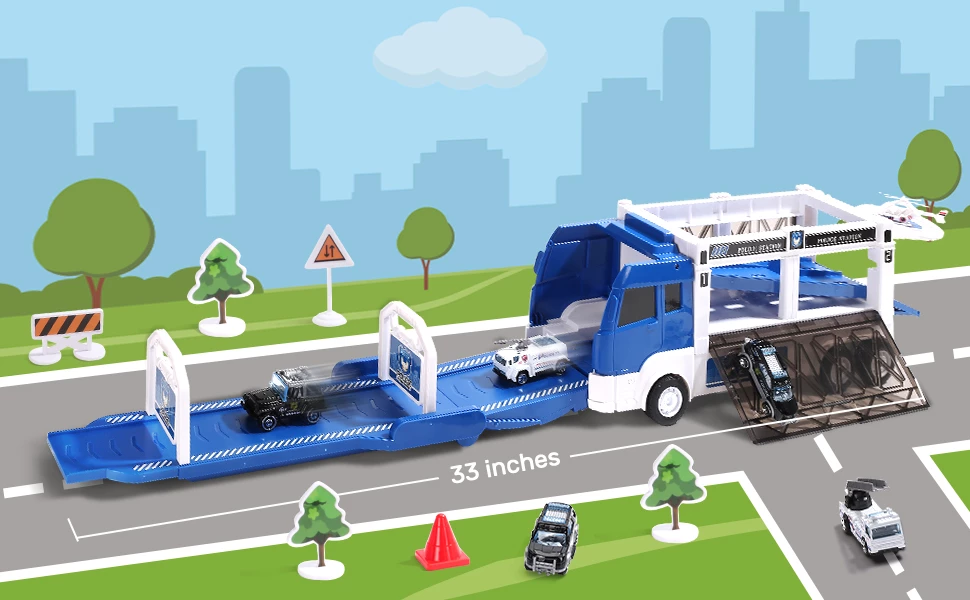 CUTE STONE Police Transport Truck w / Music & Light, Long Track, Friction Powered Carrier Truck w / 5 Mini Die-cast Cars & Helicopter