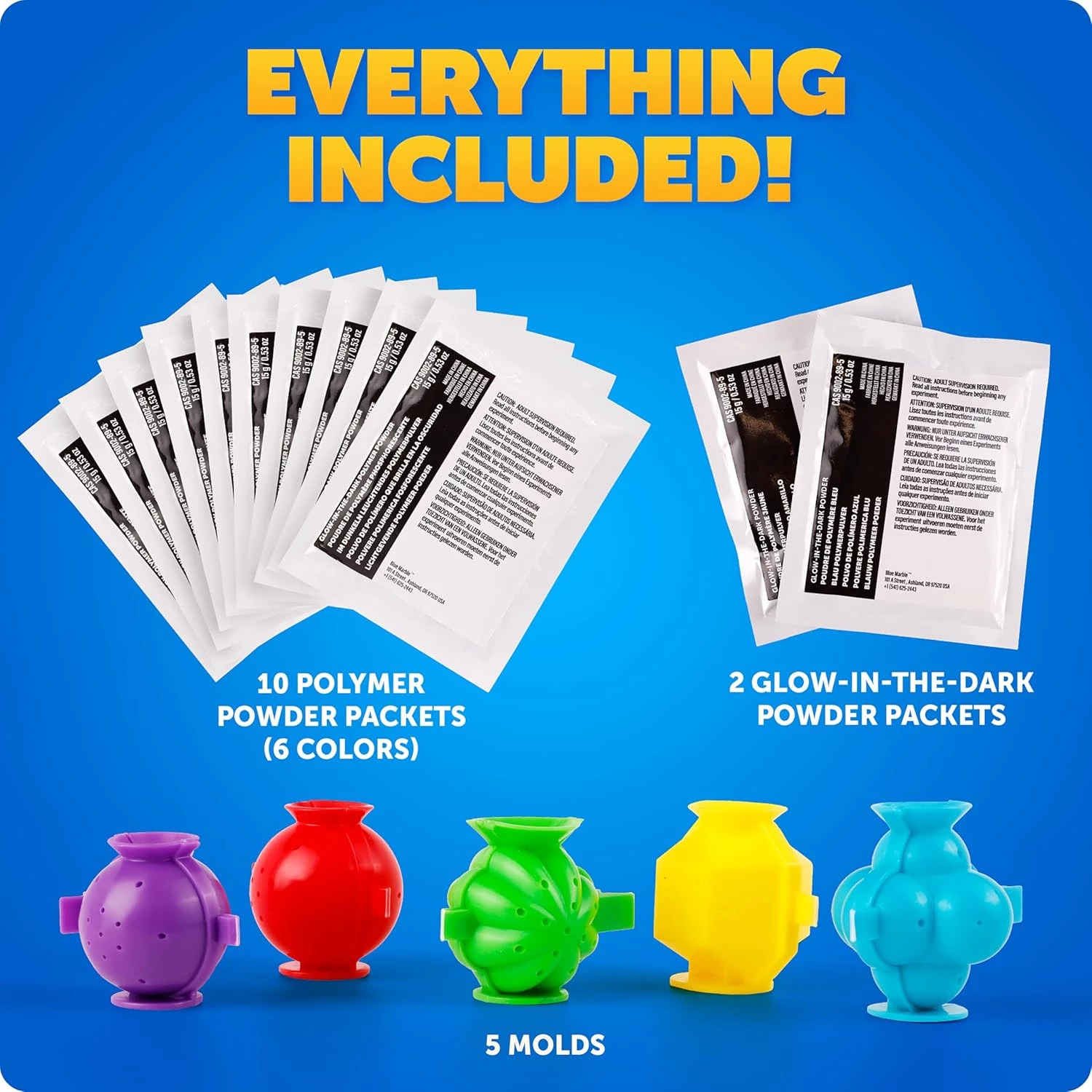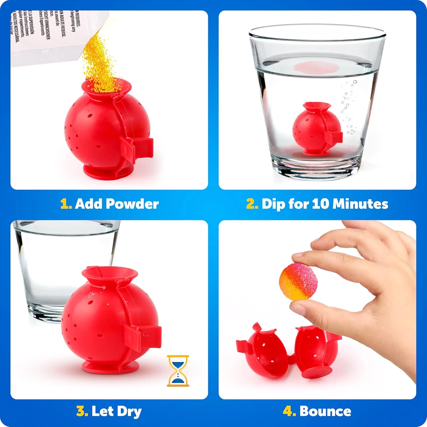 Створення стрибунців ніколи не було таким простим і захопливим. Просто виконайте чотири простих кроки: виберіть улюблені кольори, заповніть одну з п'яти форм, занурте її у воду на 10 хвилин і дайте висохнути. Не встигнете озирнутися, як у вас буде унікальний стрибучий м'ячик, готовий до гри!