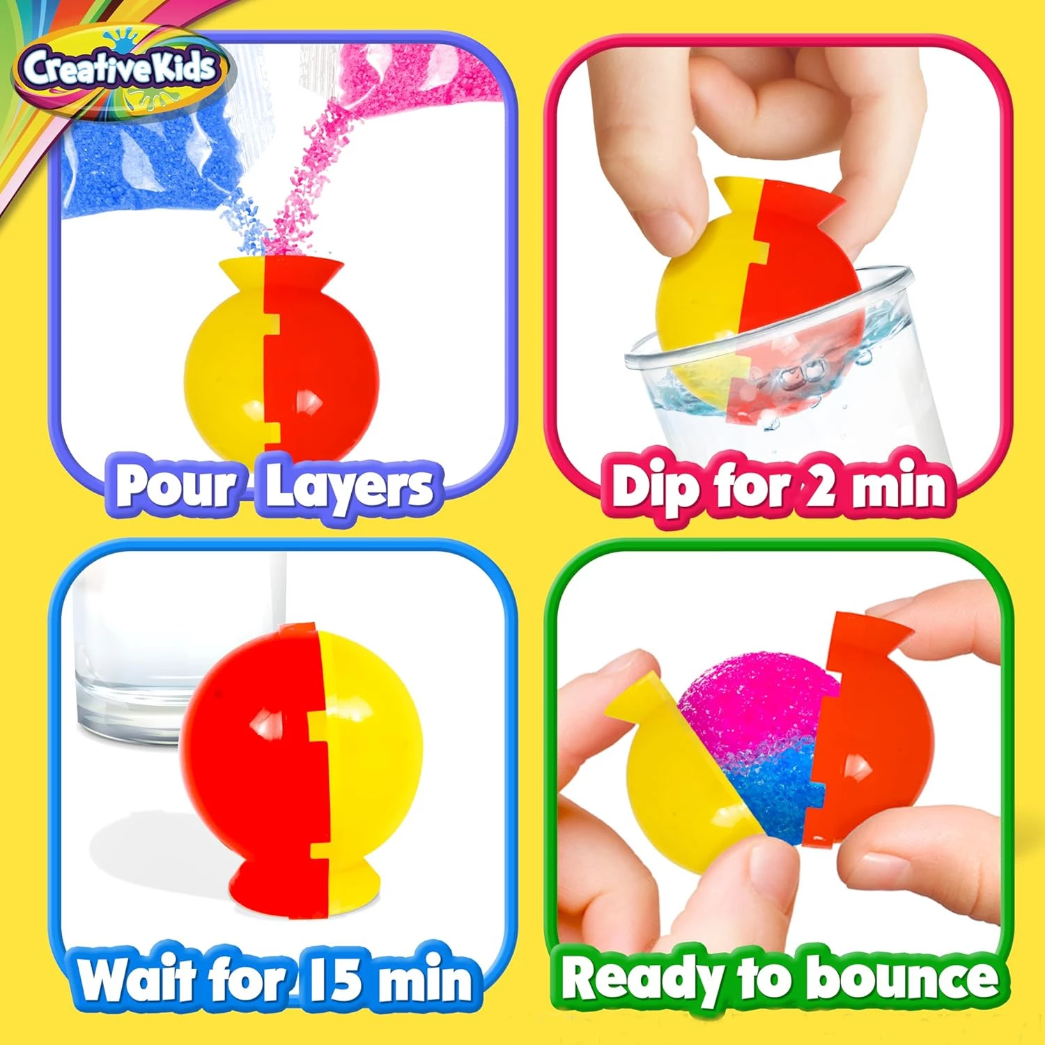 Створіть свої власні стрибунці з набором від торгової марки Creative Kids. Просто насипте кристалічний порошок у наданий контейнер, замочіть його у теплій воді приблизно на 2 хвилини та зачекайте, поки він висохне. Після висихання ви отримаєте стрибучий м'яч ідеальної форми.