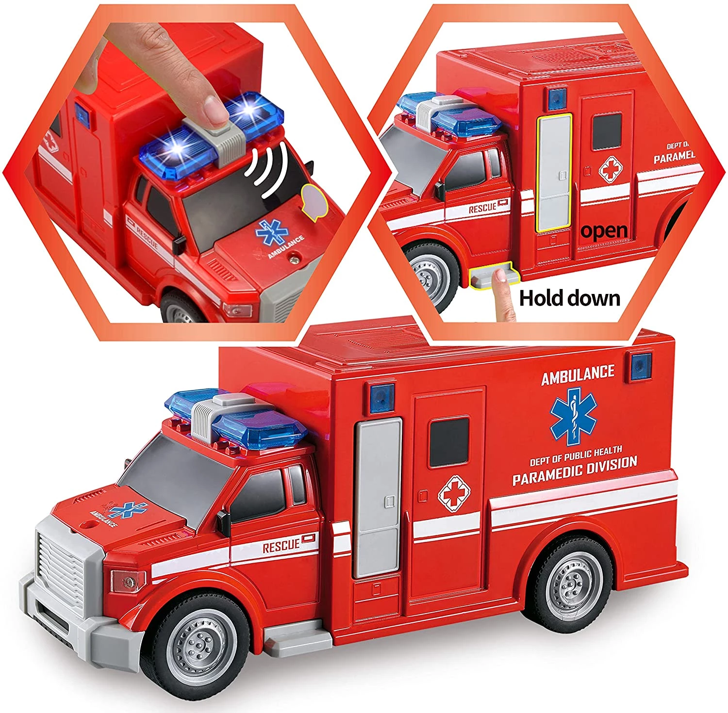 Кожна іграшка з цього автомобільного набору включає в себе кілька функцій. У пожежній машині справжній гідрант, з якого ллється вода, швидка сигналить і блимає.