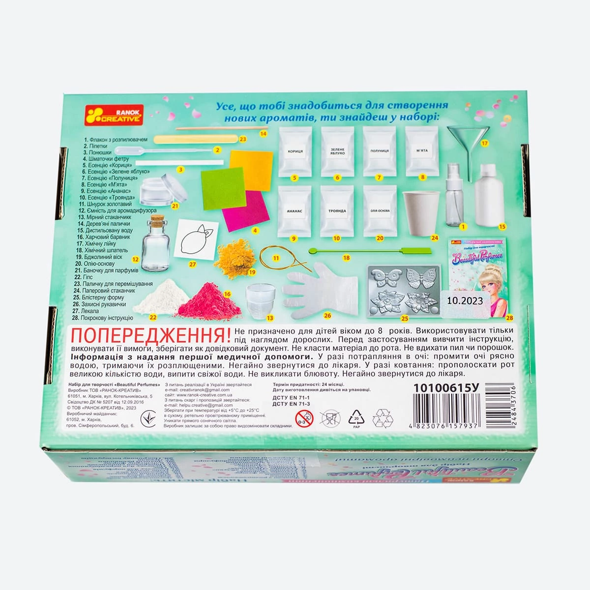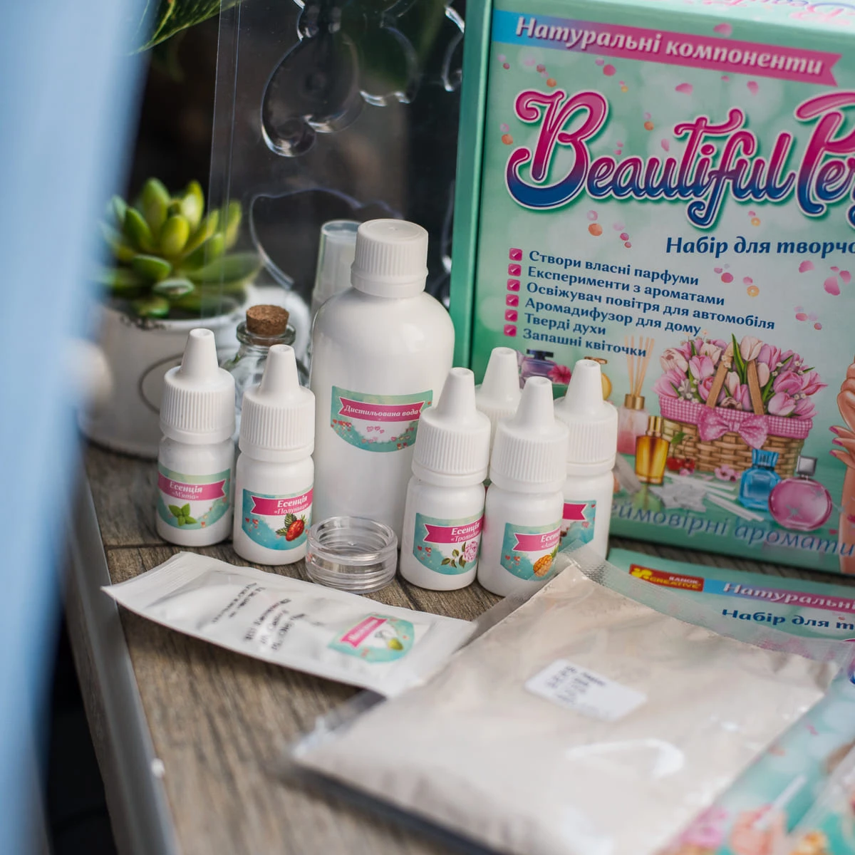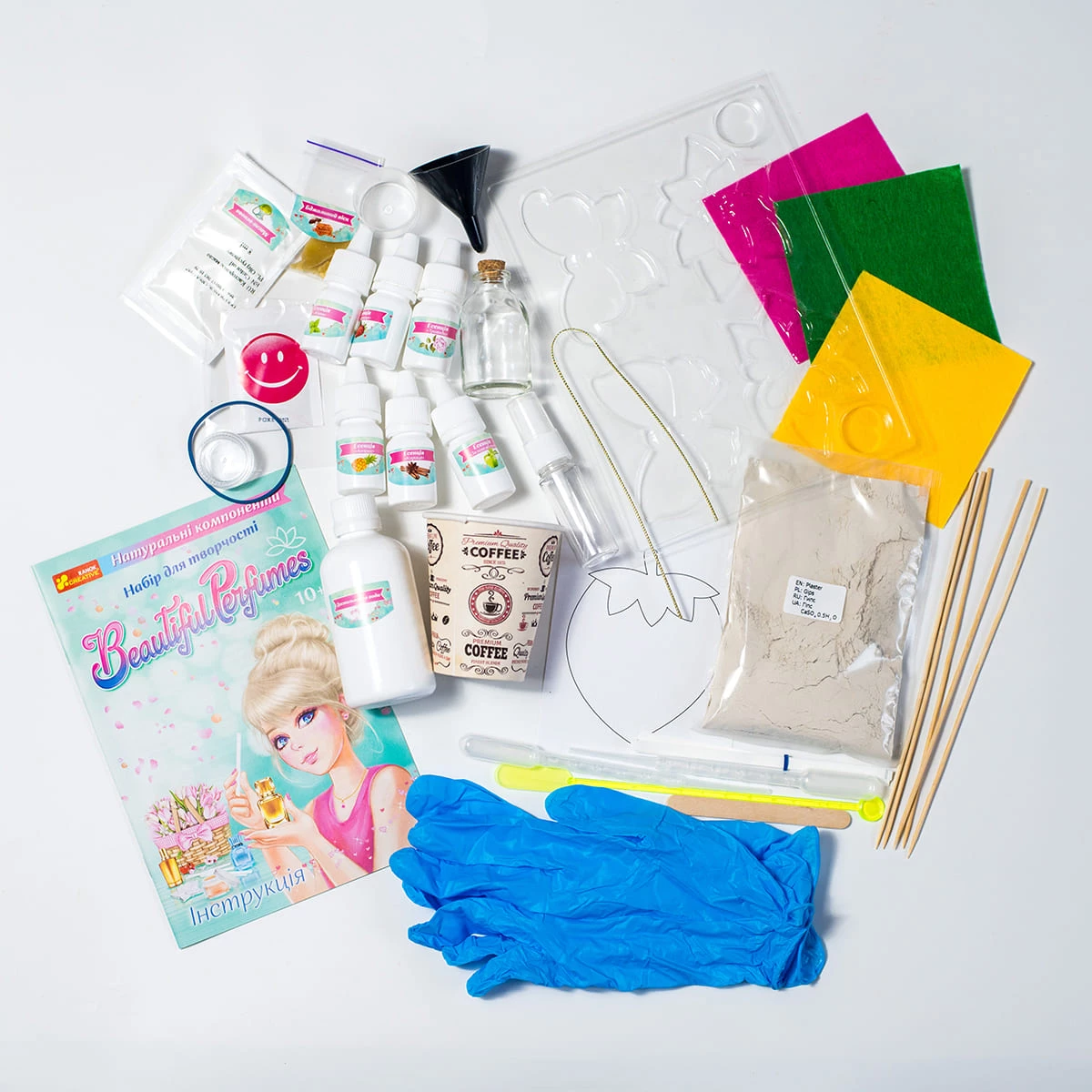 У комплект входять різні есенції, аксесуари, барвники та інші компоненти.