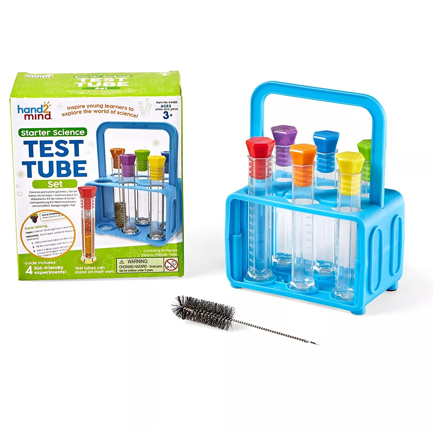 Представлений набір складається з шести пробірок з плоским дном, такої ж кількості пробок різних кольорів, штатива та однієї багаторазової щітки для очищення. Кольорові пробки замикаються, щоб виключити проливання. У комплект входить інструкція, в якій міститься чотири наукові експерименти, що підходять для дітей.