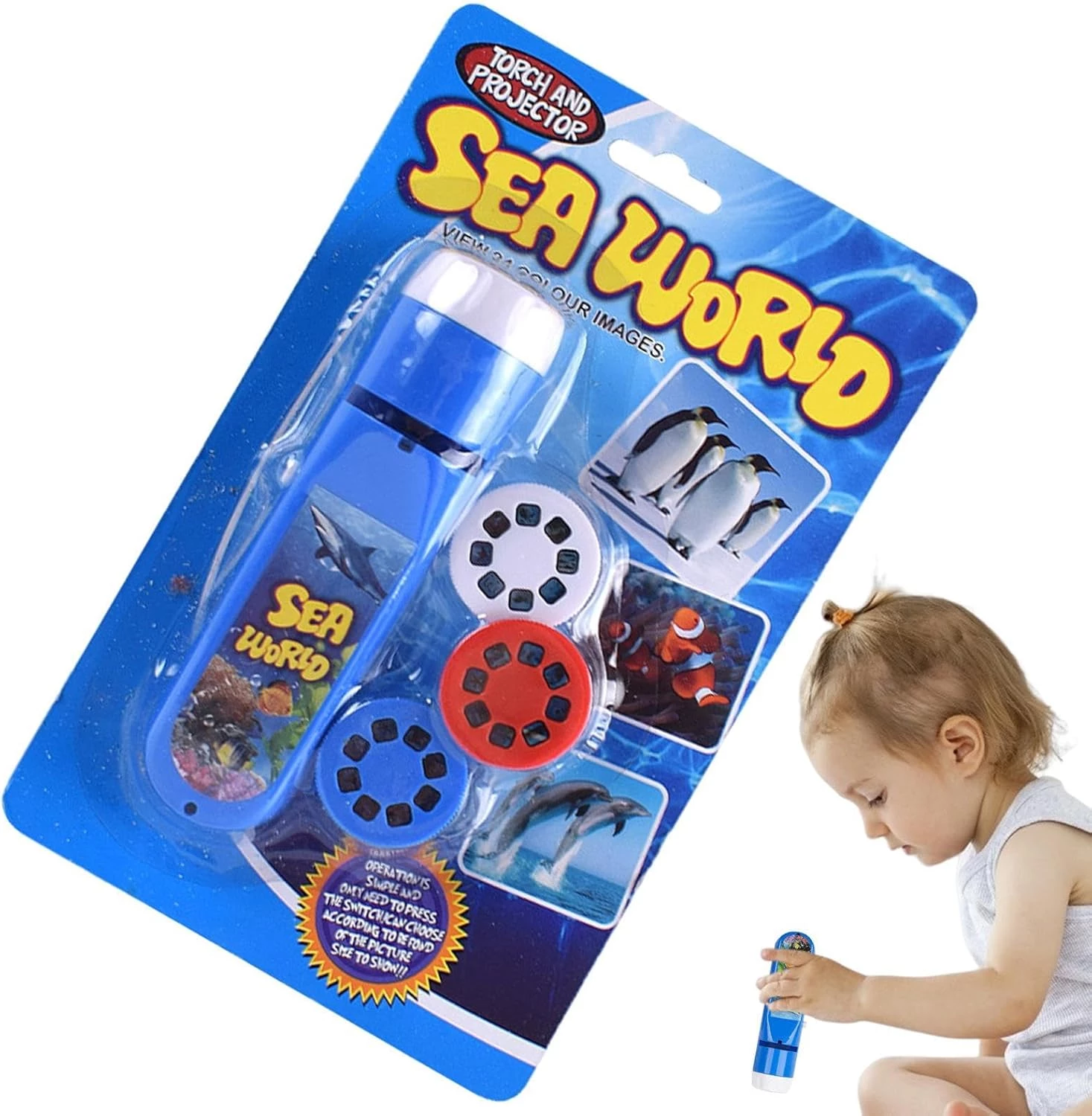 Представлений набір включає три змінні диски, на яких записані 24 унікальних кольорових кадри з дельфінами, пінгвінами, акулами, кораловими рибками та іншими жителями океанів і морів. Іграшка працює у двох режимах: як звичайний кишеньковий ліхтарик і як проектор для проектування зображень на стіну або стелю.