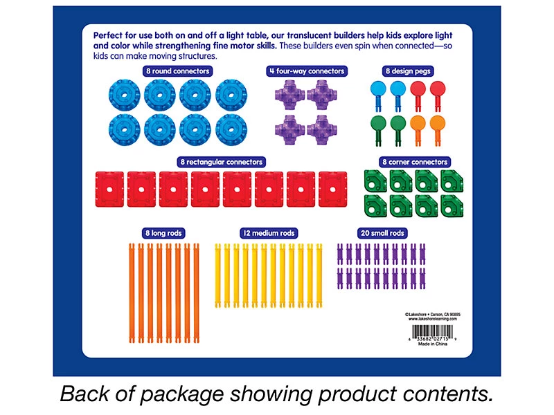 Розвиток дрібної моторики ще ніколи не був таким захоплюючим! Напівпрозорі деталі конструктора, ідеально підходять для використання як на світловому столі, так і за його межами. Допомагають дітям досліджувати світ і колір в процесі створення. Крім того, частини з'єднуються одним клацанням, так що діти можуть використовувати нескінченні можливості будівництва.