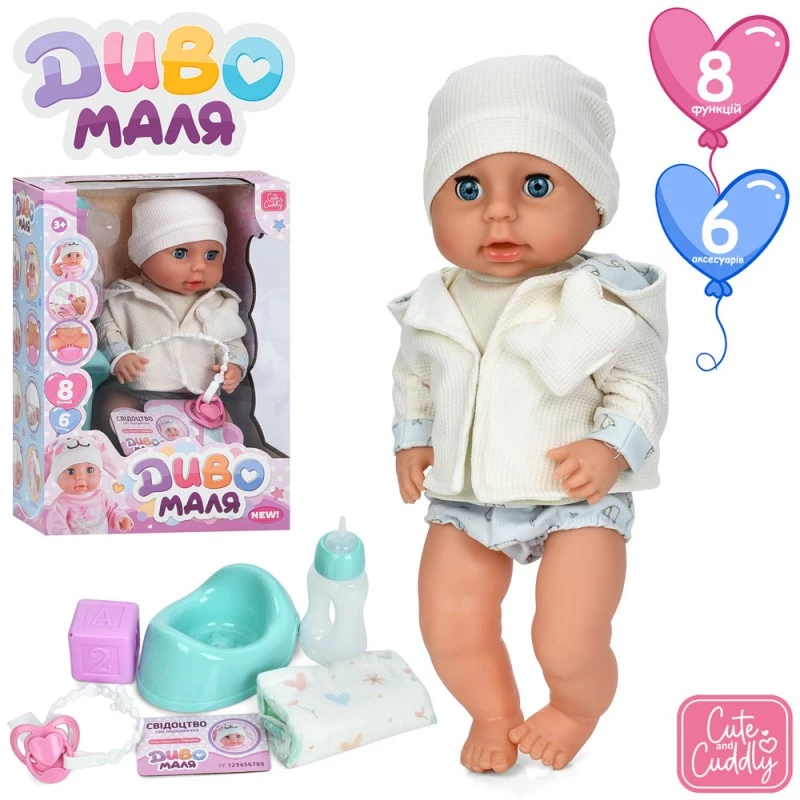 Цей милий пупс подарує вашій дитині тільки найпозитивніші емоції. Безперечно, ваша донечка зрадіє милому малюкові, який «вміє» розповідати віршики та співати пісеньки українською мовою. Дитина отримає море задоволення від гри з пупсом. Цього милого малюка можна брати на прогулянки, возити у візочку, брати його з собою в ліжечко, на сніданок, обід та вечерю.