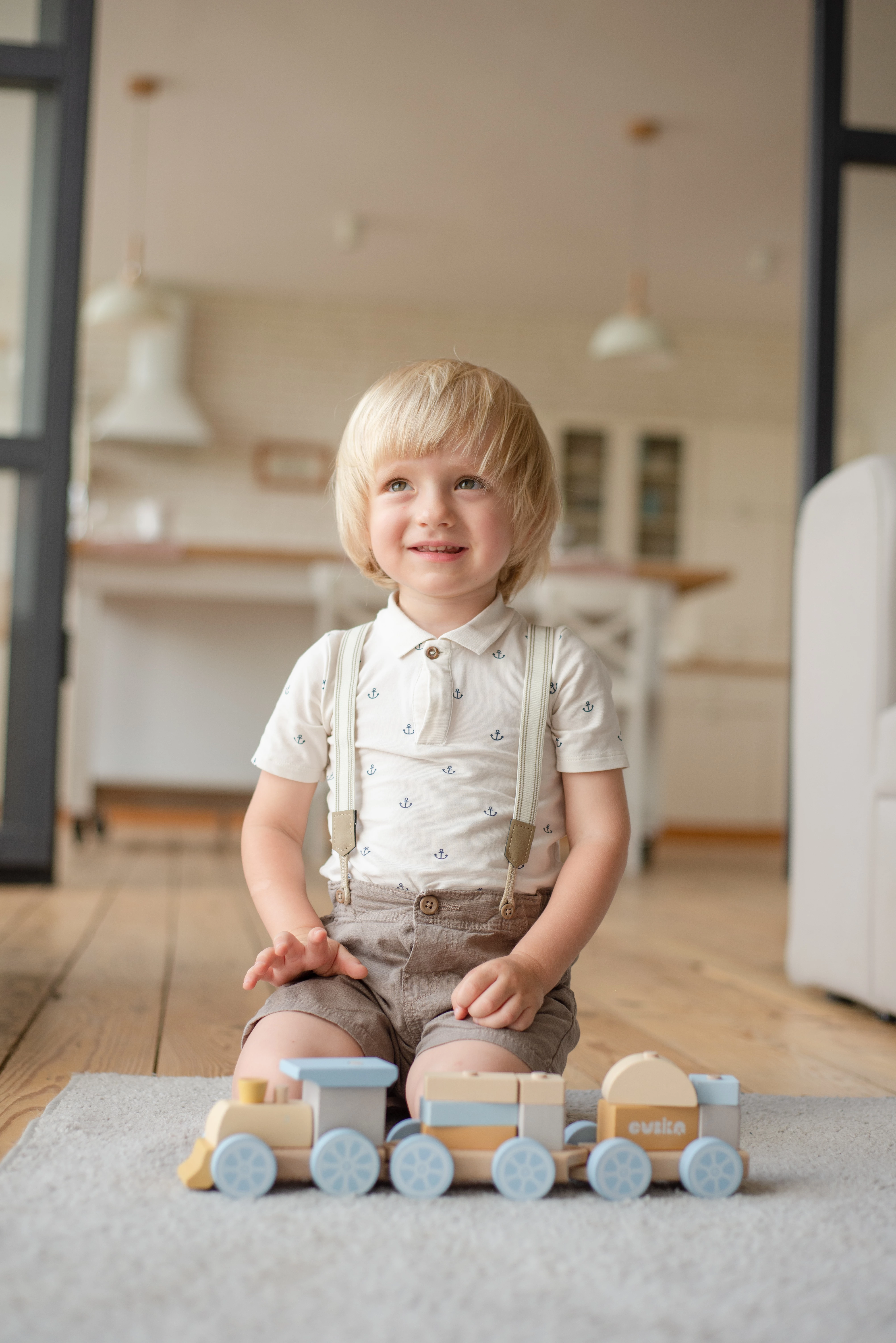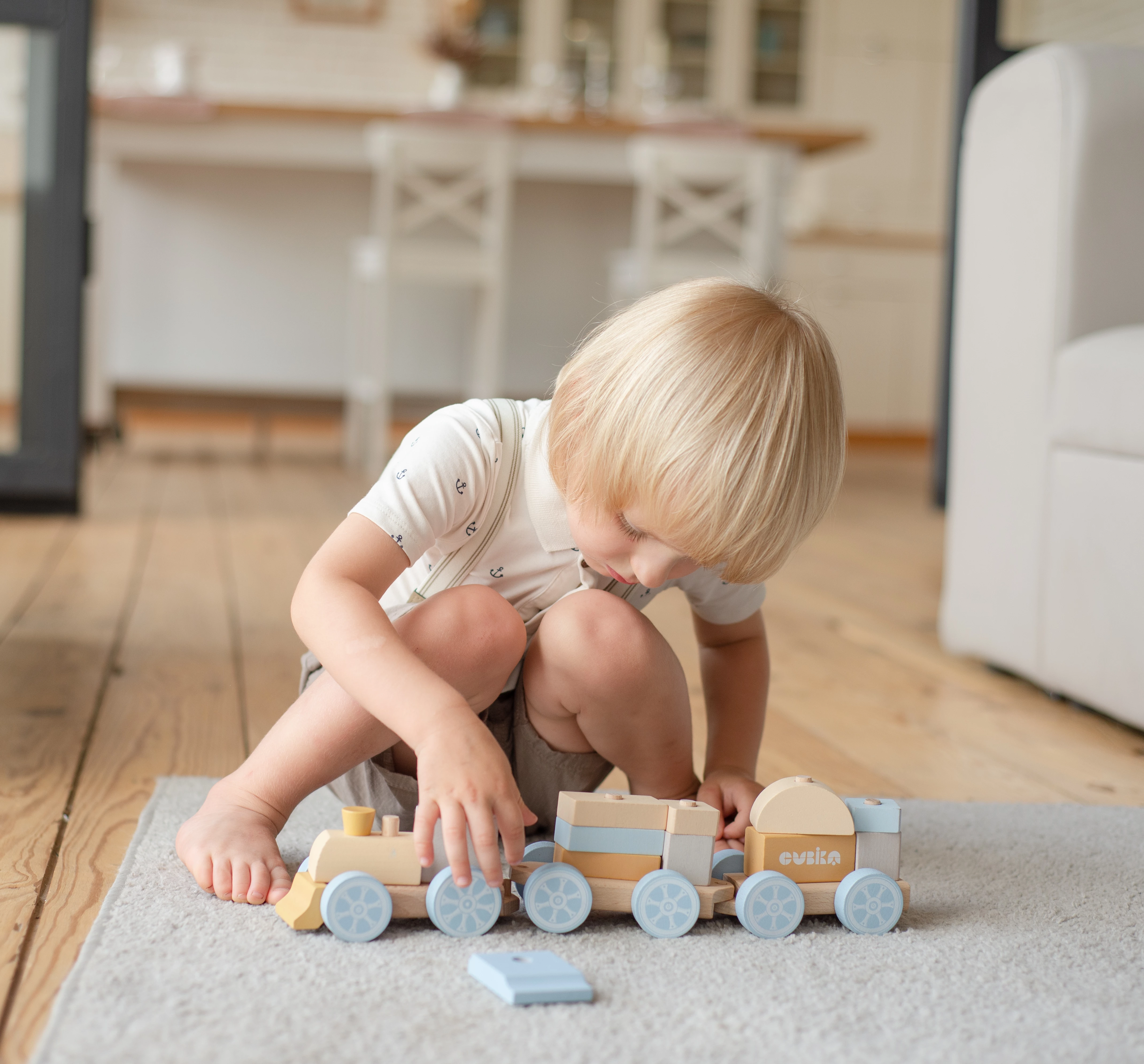 Особливість іграшки — пастельна кольорова гама, яка позитивно впливає на дитяче сприйняття та естетичний смак. Кожна деталь ретельно відшліфована та покрита гіпоалергенною фарбою на водній основі, що гарантує повну безпеку під час гри. Збираючи та розбираючи вагони, малюк розвиватиме дрібну моторику, логічне мислення та координацію рухів.