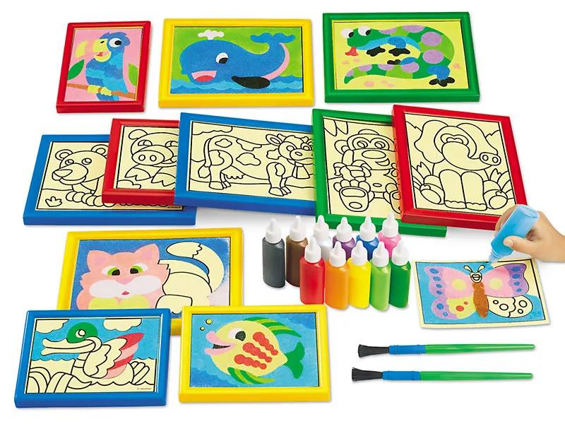 Чудова розмальовка! Те, що пісок знаходиться в тюбиках, значно полегшує завдання 4-річній дитині, а щіточки добре справляються з рівномірним розподілом піску.