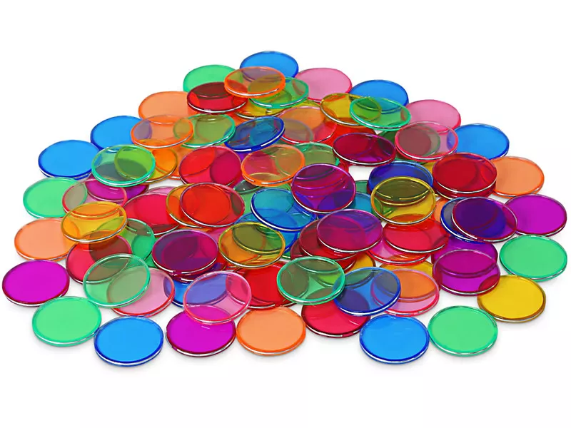 Також ці яскраві напівпрозорі фішки сприяють розвитку математичних навичок – від рахунку та сортування до побудови шаблонів. Ви навіть можете використовувати їх на столі з підсвічуванням, аби зробити заняття та ігри яскравішими! Міцні пластикові фішки бувають різних типів і мають сталеве кільце зовні, що ідеально підходить для магнітного тяжіння. Кожен чіп має діаметр 2 см.