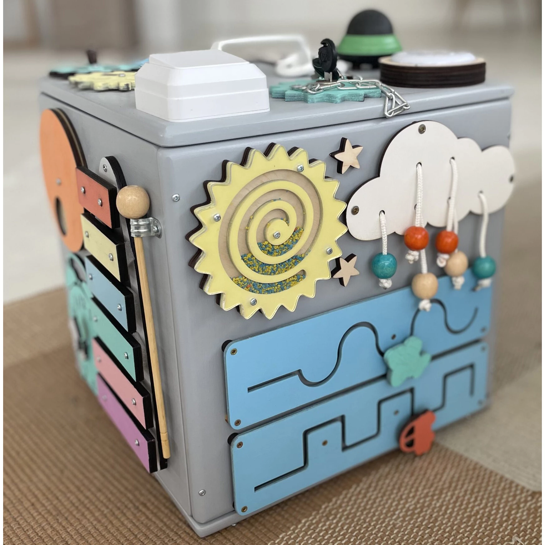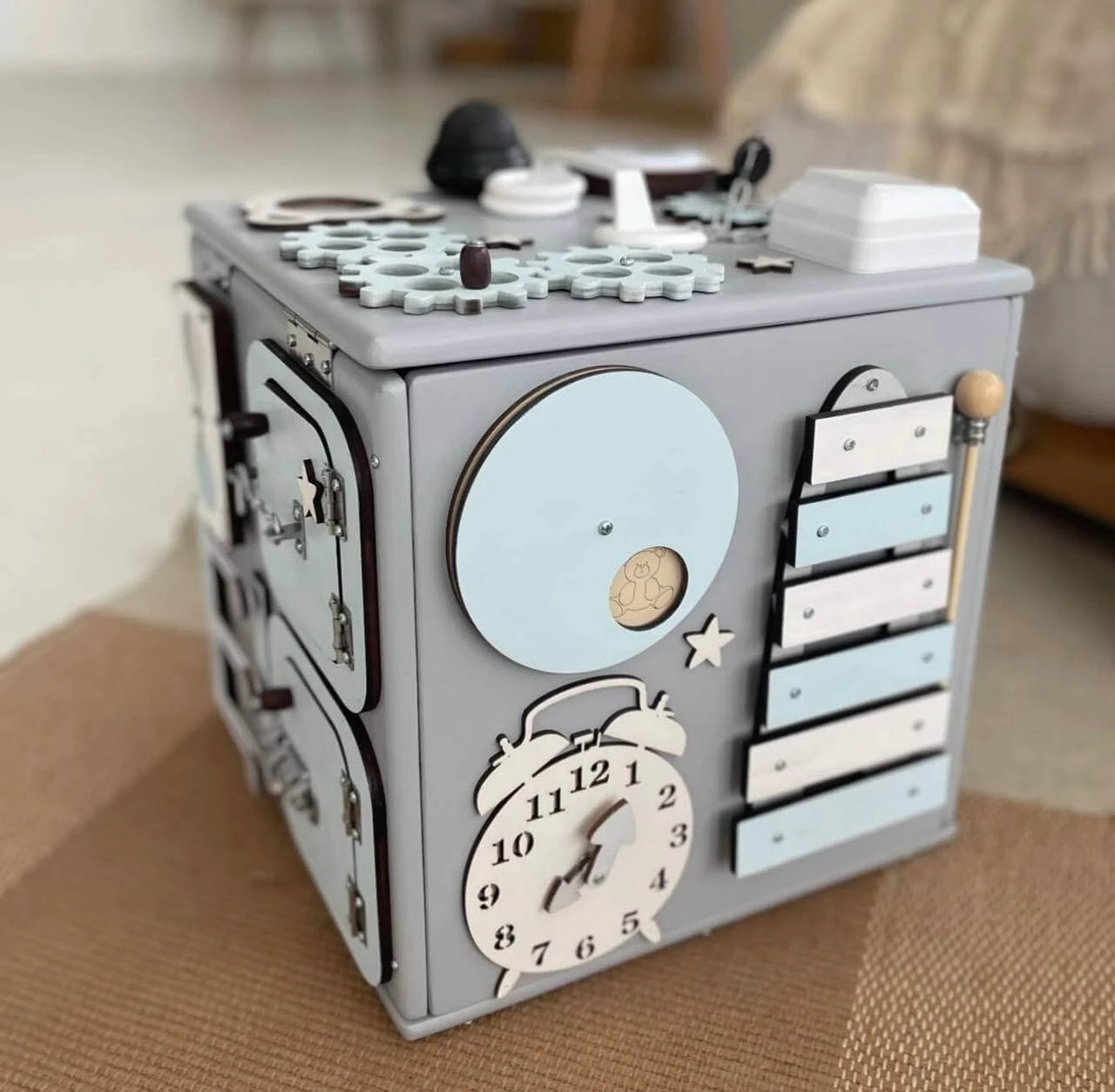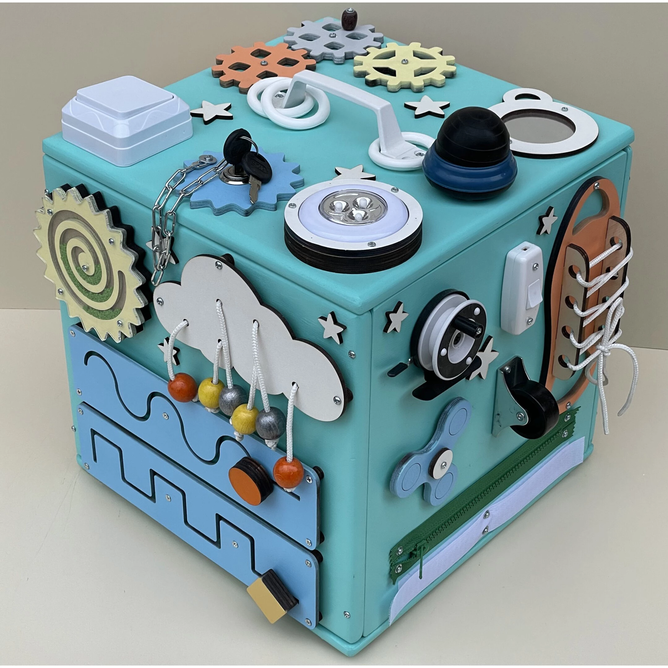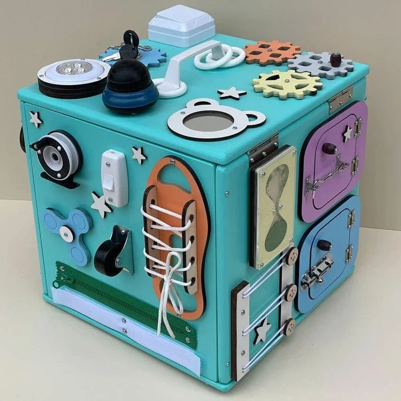 Бізіборд оснащений всілякими шестернями, вимикачами, лабіринтами, годинниками та іншими пристроями, які неодмінно зацікавлять малюків та забезпечать захопливу і пізнавальну гру. Завдяки кришці, що відкривається, ви зможете зберігати всередині даного куба невеликі дитячі іграшки.
