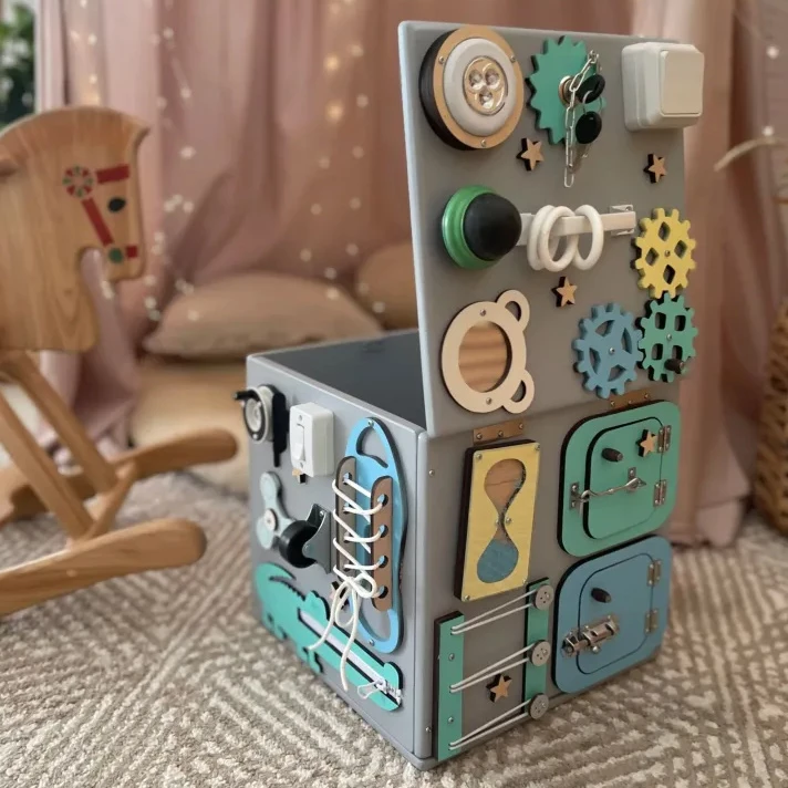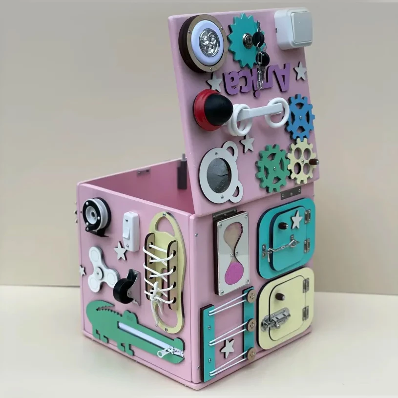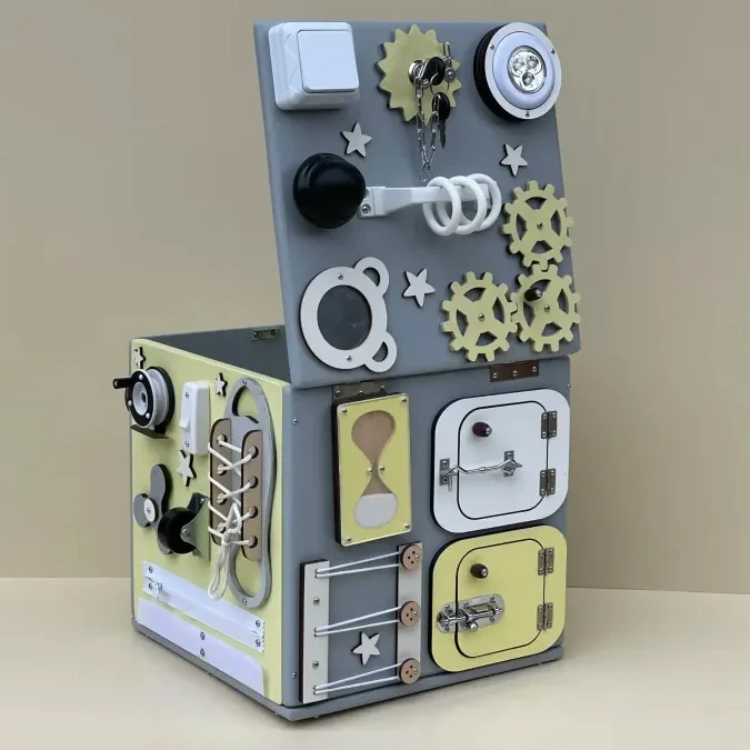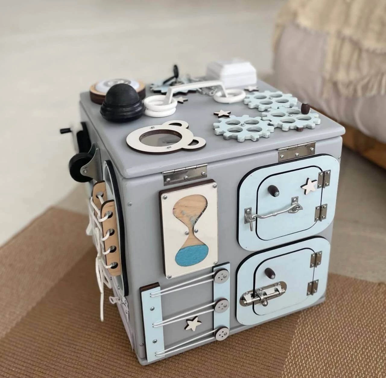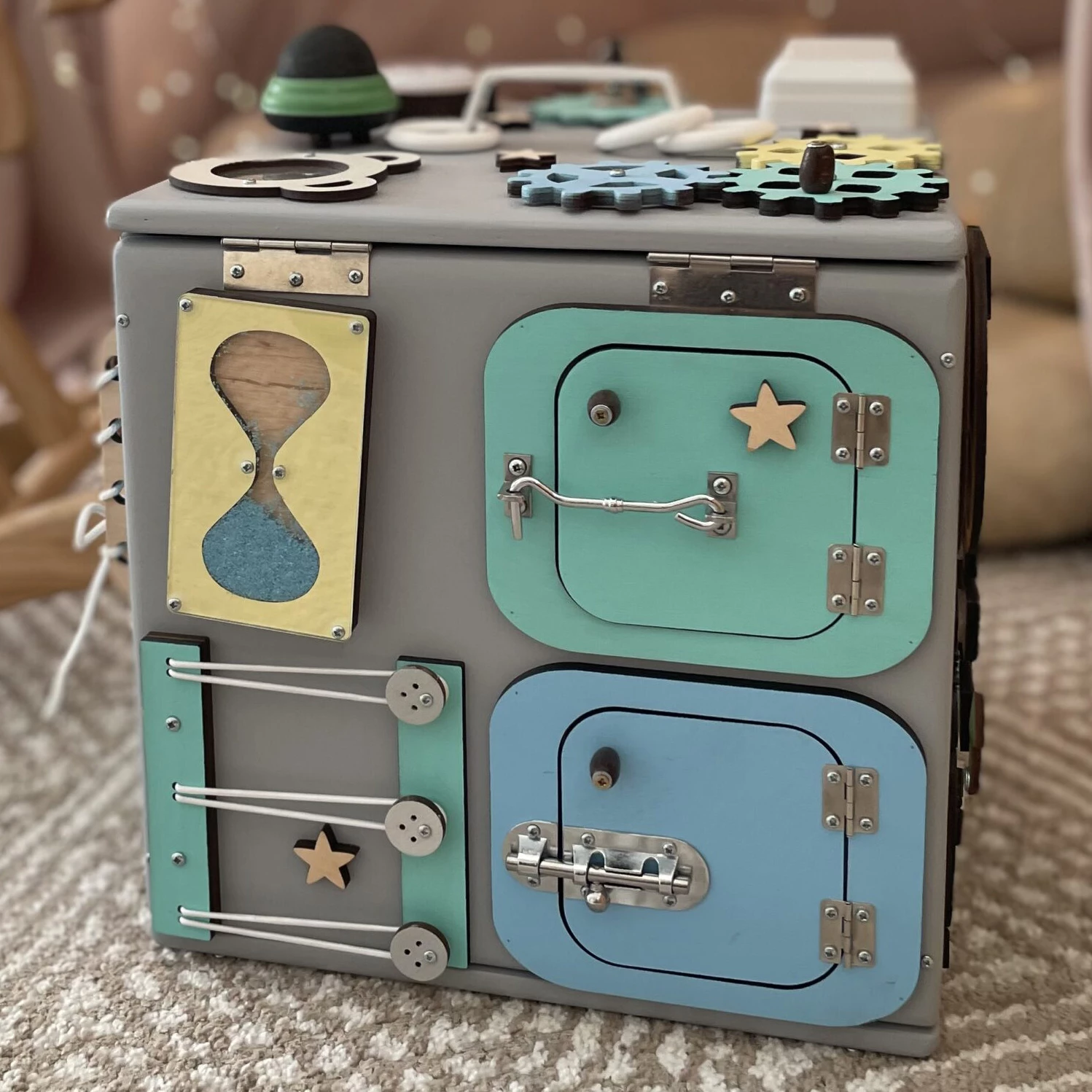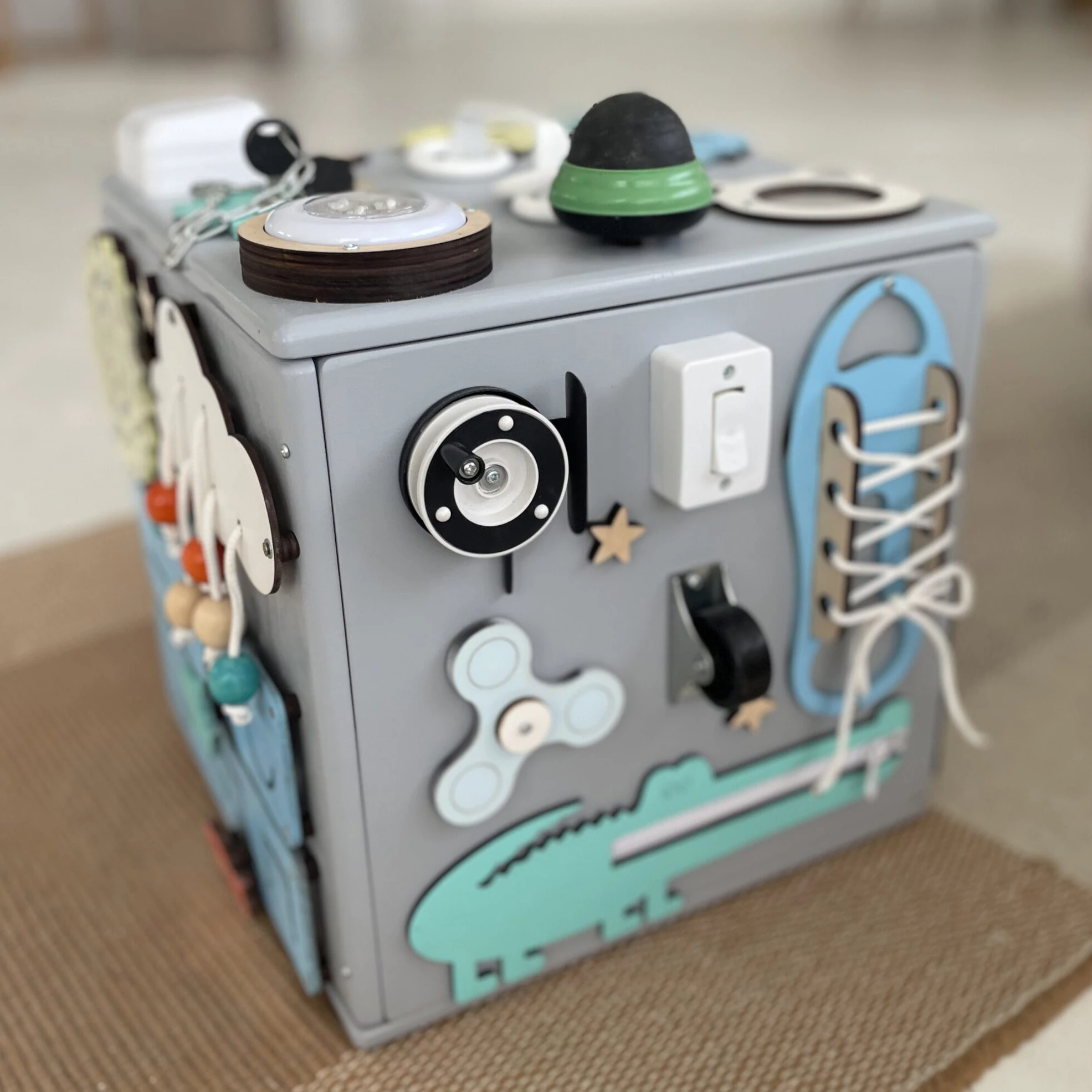 Бізіборд оснащений всілякими шестернями, вимикачами, лабіринтами, годинниками та іншими пристроями, які неодмінно зацікавлять малюків та забезпечать захопливу і пізнавальну гру. Завдяки кришці, що відкривається, ви зможете зберігати всередині даного куба невеликі дитячі іграшки.