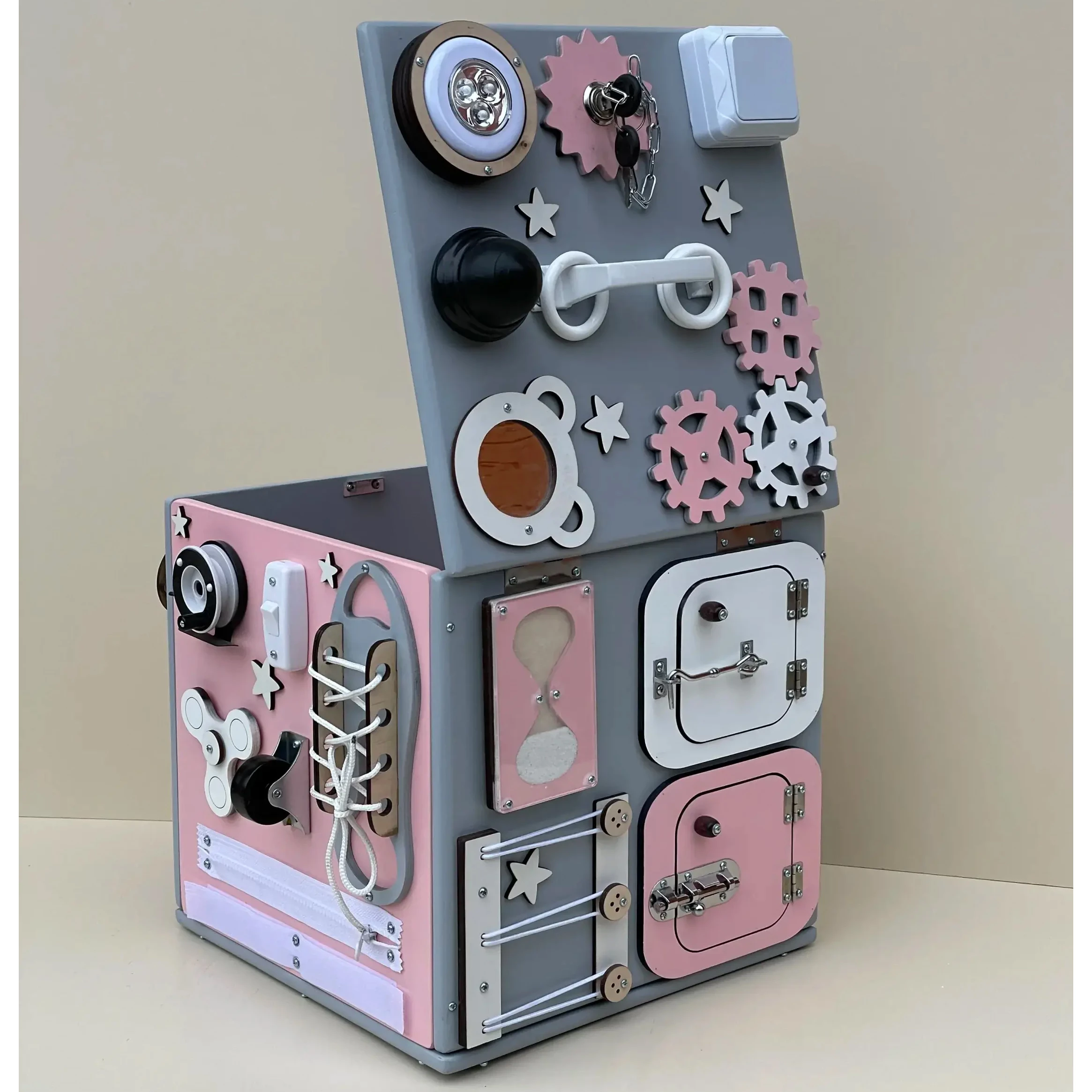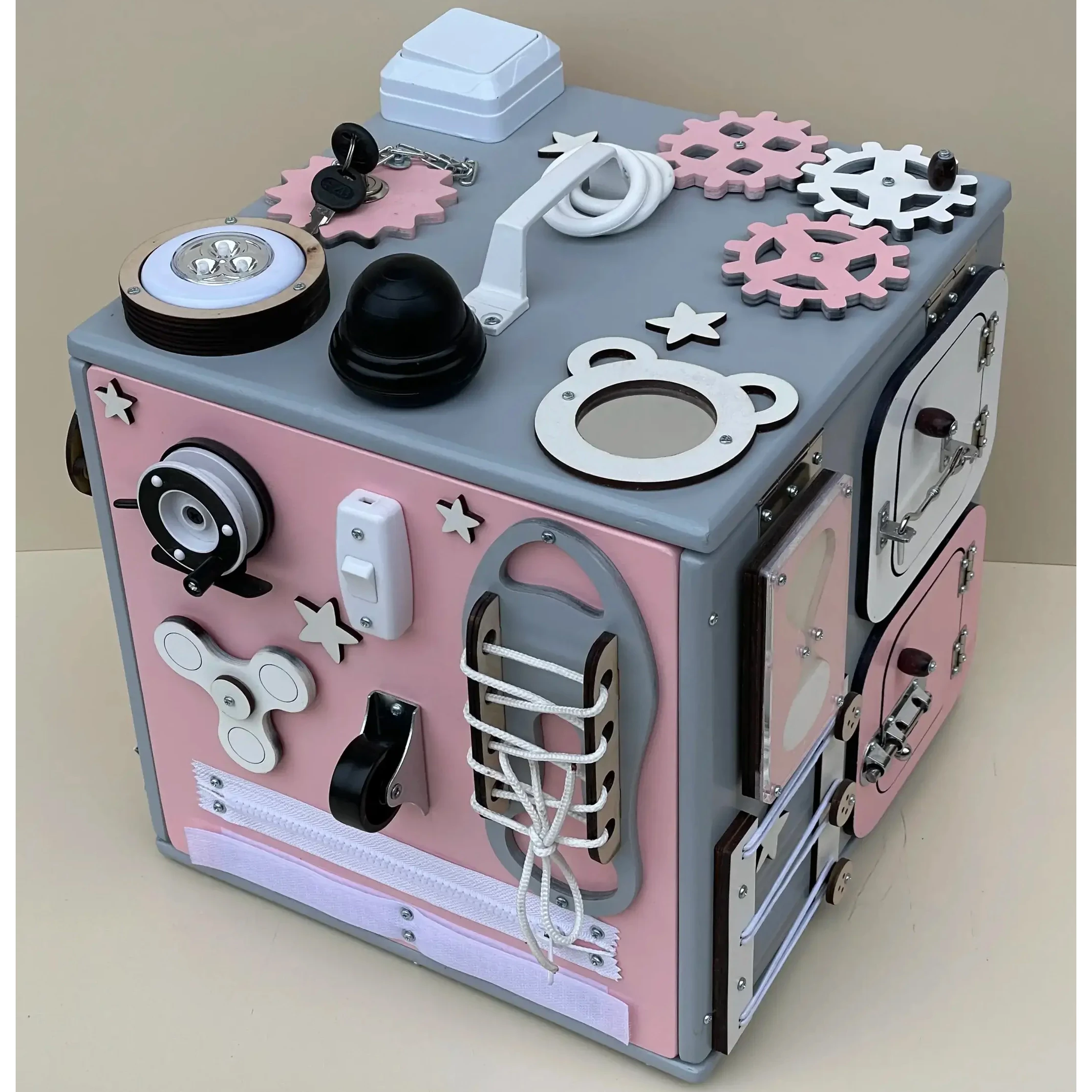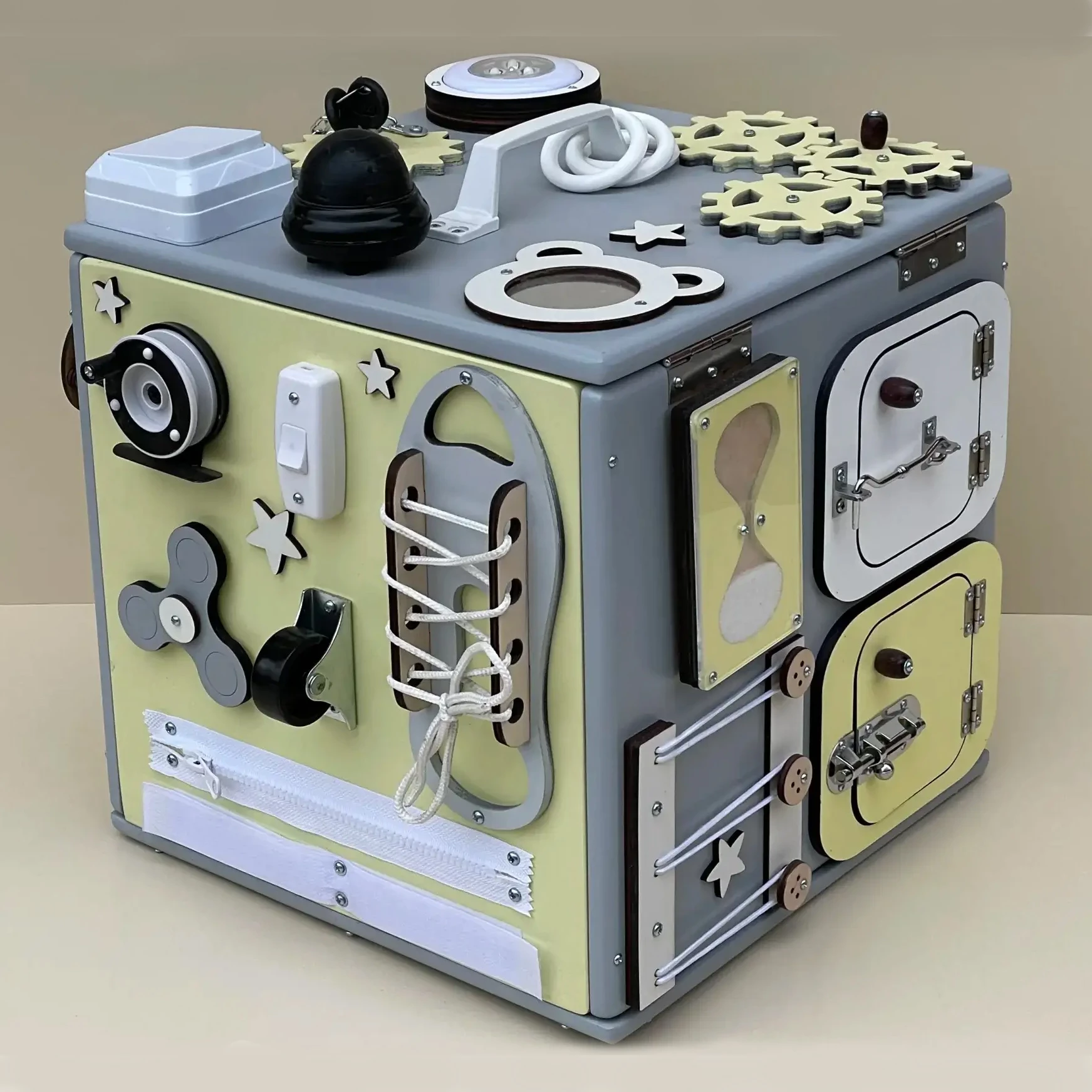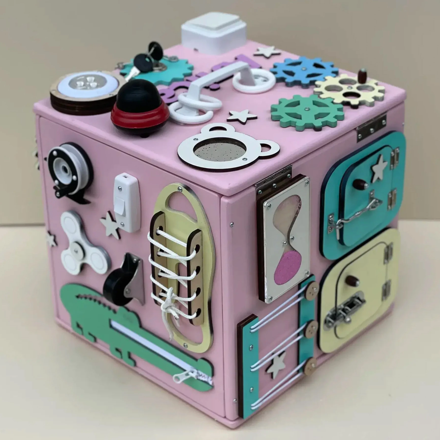 Бізіборд оснащений всілякими шестернями, вимикачами, лабіринтами, годинниками та іншими пристроями, які неодмінно зацікавлять малюків та забезпечать захопливу і пізнавальну гру. Завдяки кришці, що відкривається, ви зможете зберігати всередині даного куба невеликі дитячі іграшки.