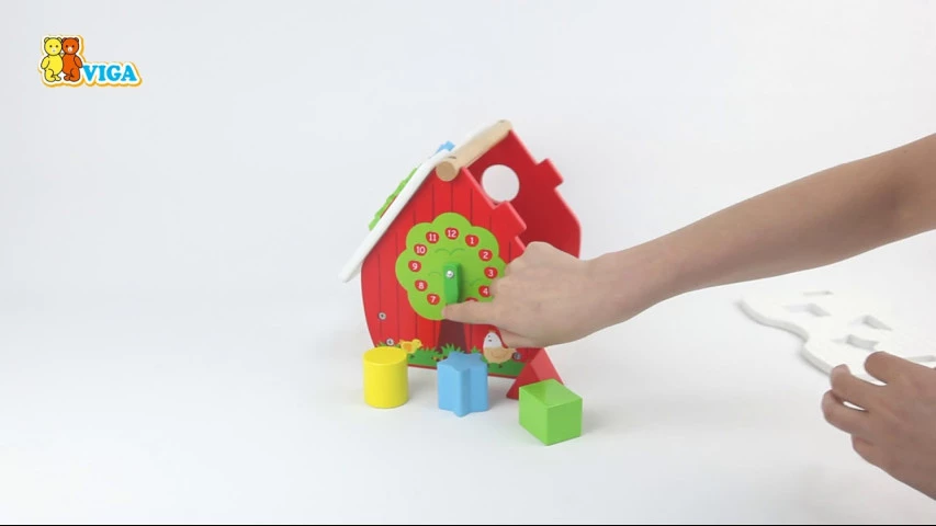 Гарний дерев'яний будиночок ферма зі зручною ручкою, який зручно носити з собою. У ньому стільки цікавого для малюка: кольорові обертаючі шестерні, фігурки для сортера і годинник для вивчення часу. Дах будиночка можна зняти, щоб дістати фігури сортера.