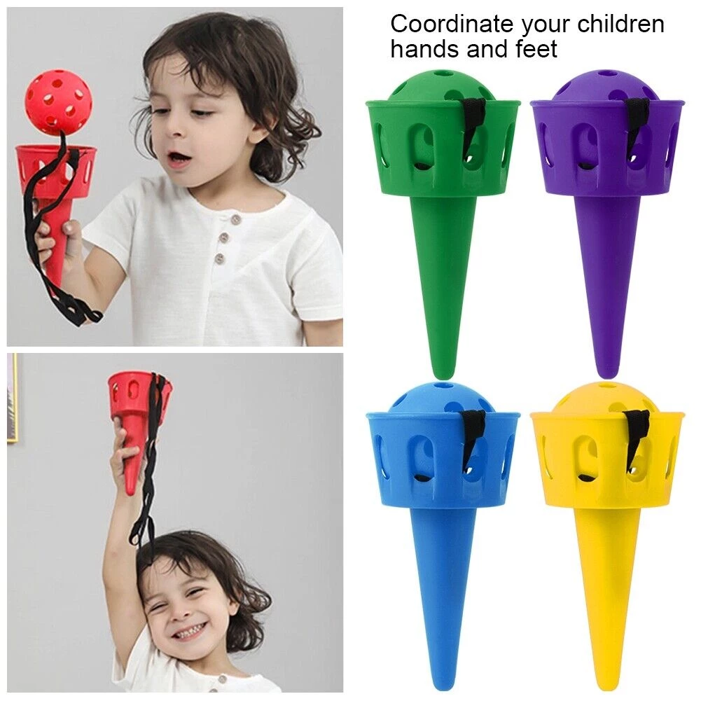 Весела і безпечна гра в яку діти можуть грати самі! Міцні пластикові стаканчики у формі ріжка морозива дуже сподобаються діткам. До них прикріплена забавна легка кулька, за допомогою тканинного шнура. Діти підкидають м'ячик і ловлять його стаканчиком.