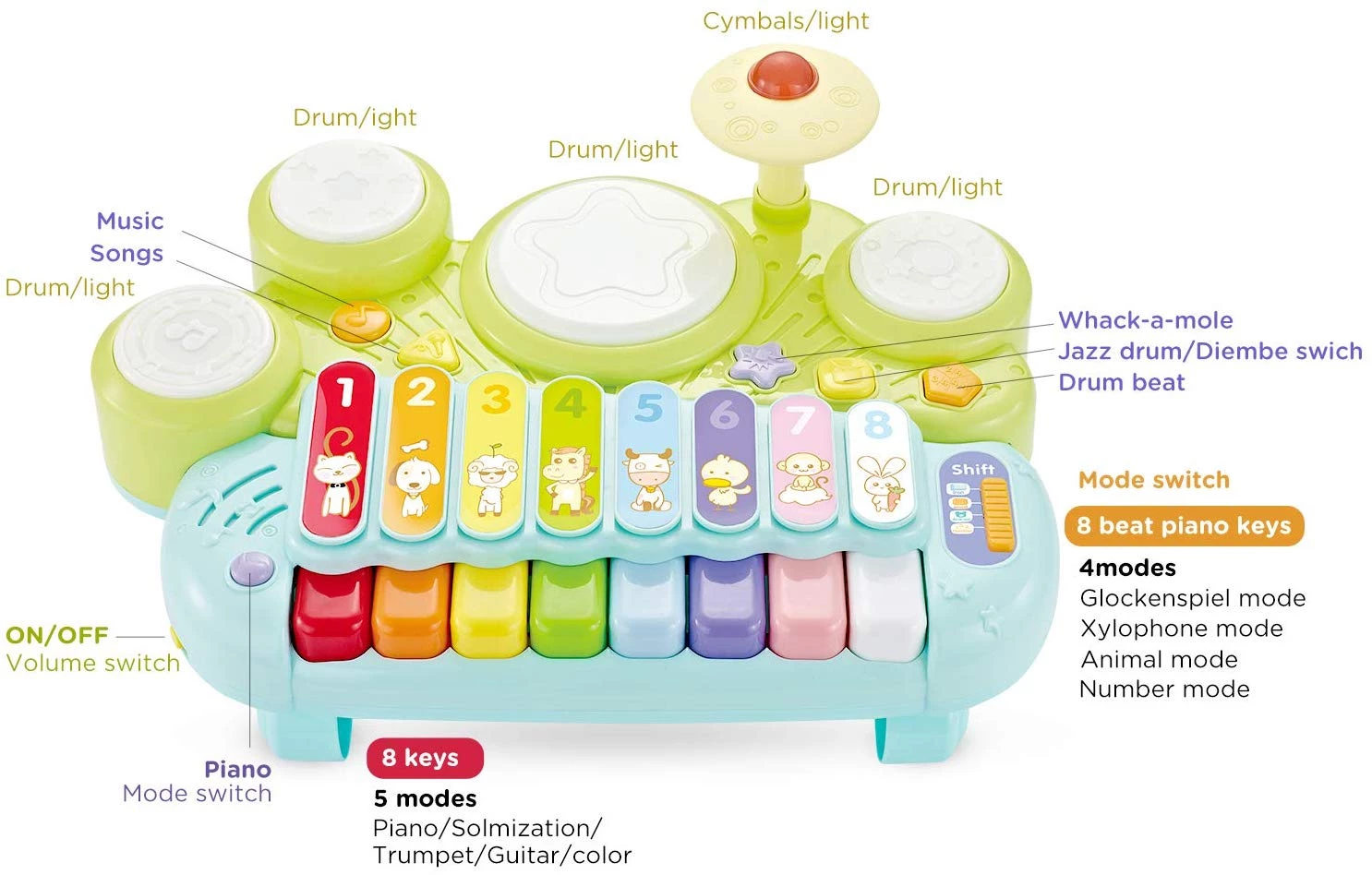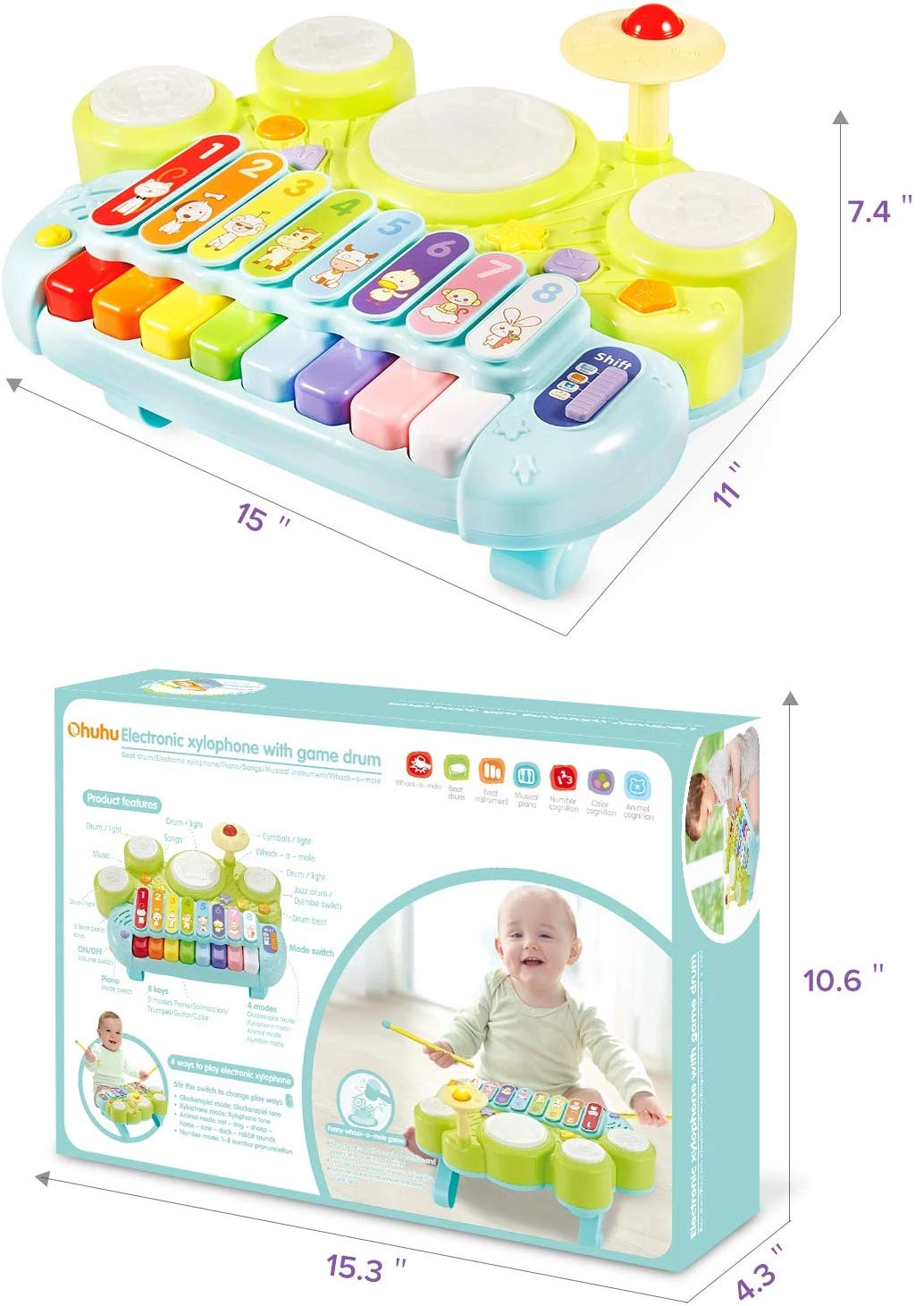 Цікава музична іграшка Ксилофон з 18 веселими пісеньками (10 класичних мелодій і 8 дитячих віршів). Можна вибрати між різними звуковими ефектами: ксилофон, гітара, труба чи фортепіано! Це не просто інструмент, це справжній музичний центр. Різнобарвні клавіші - це швидкий і простий спосіб вивчити кольори, звуки тварин і цифри. Ксилофон також включає в себе гру в WHA-A-MOL, мелодії, 2 види режимів гри, джазовий барабан, 3 види режиму ударних 2/4 3/4 4/4.