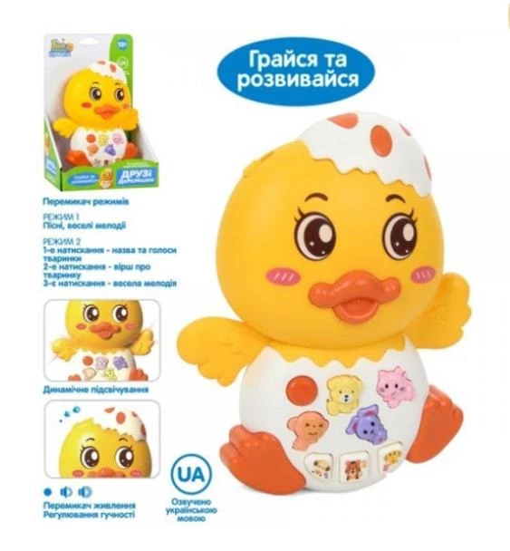 Музична іграшка каченя з яскравими кольоровими кнопками на животику грає різні мелодії і звуки. Якщо натиснути на чубчик на голові каченяти - він почне кататися по кімнаті. При русі каченя кліпає очима, клацає дзьобом, махає світяться крилами і співає пісеньки. Може довільно змінювати напрямок руху, допомагаючи повзе дитині розвивати координацію рухів і роботу м'язів.