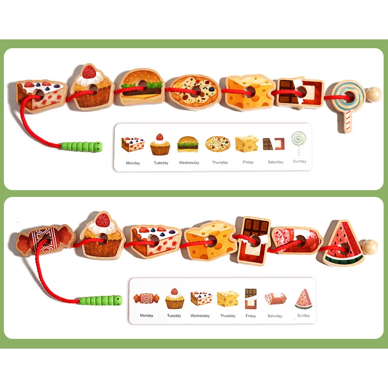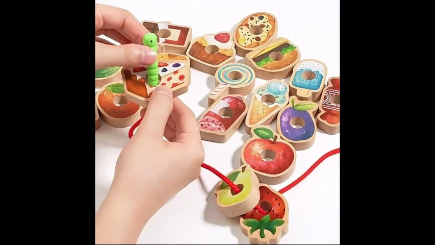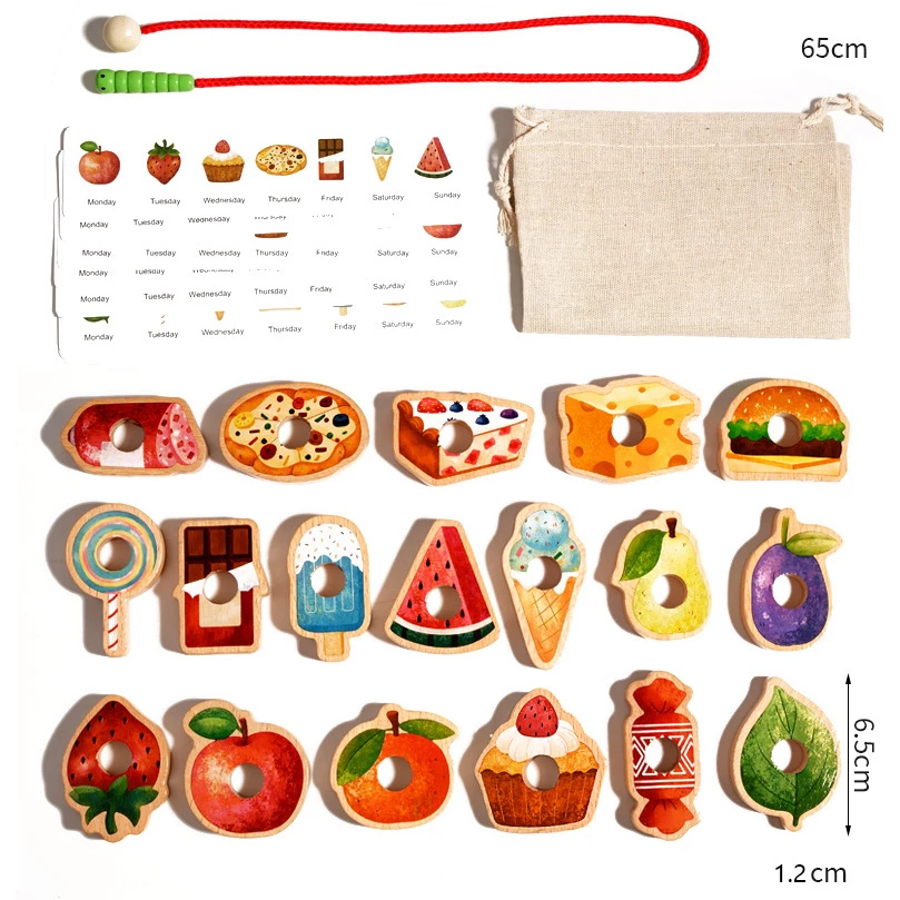 - 18 фігурок фруктів та їжі для нанизування,