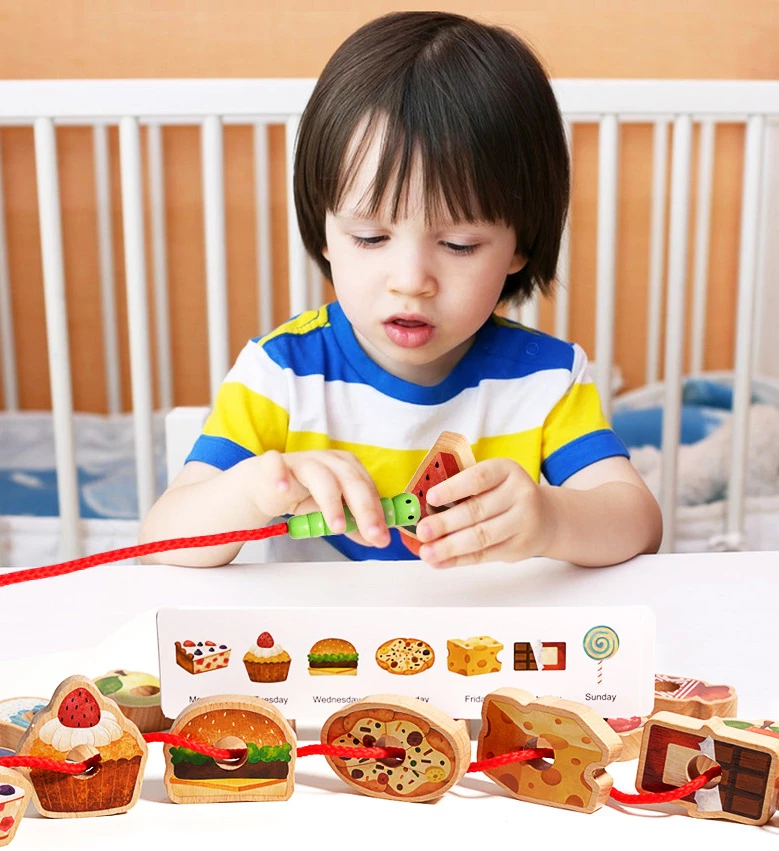 Подаруйте дитині корисне дозвілля! Набір включає 18 фігурок-продуктів (фрукти, десерти) та шнурок, на які їх потрібно нанизувати.