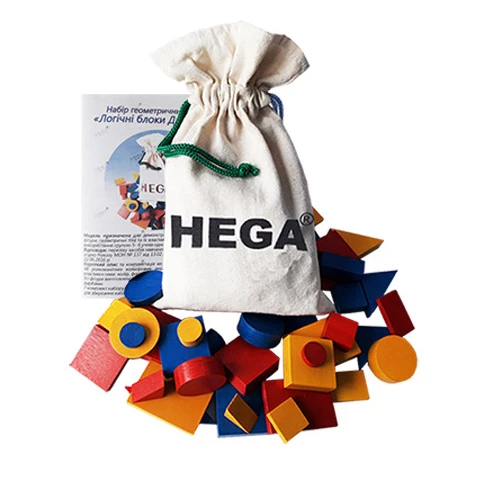 Призначення даного набору — дати дитині уявлення про форму, колір та розмір предмета. Розвиваючий набір «Блоки Дьєнеша» від торгової марки Hega допоможе дитині навчитися групувати предмети за загальними ознаками, викладати за зразком, будувати ряд за алгоритмом. Навчальний комплект можна використовувати для вступних занять з інформатики.