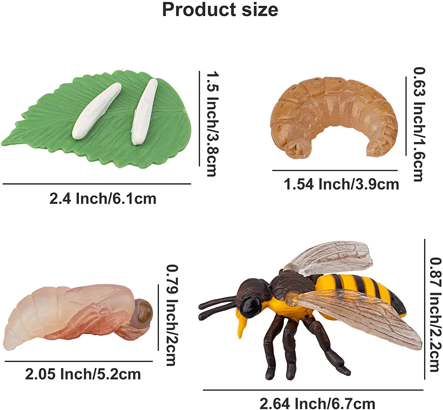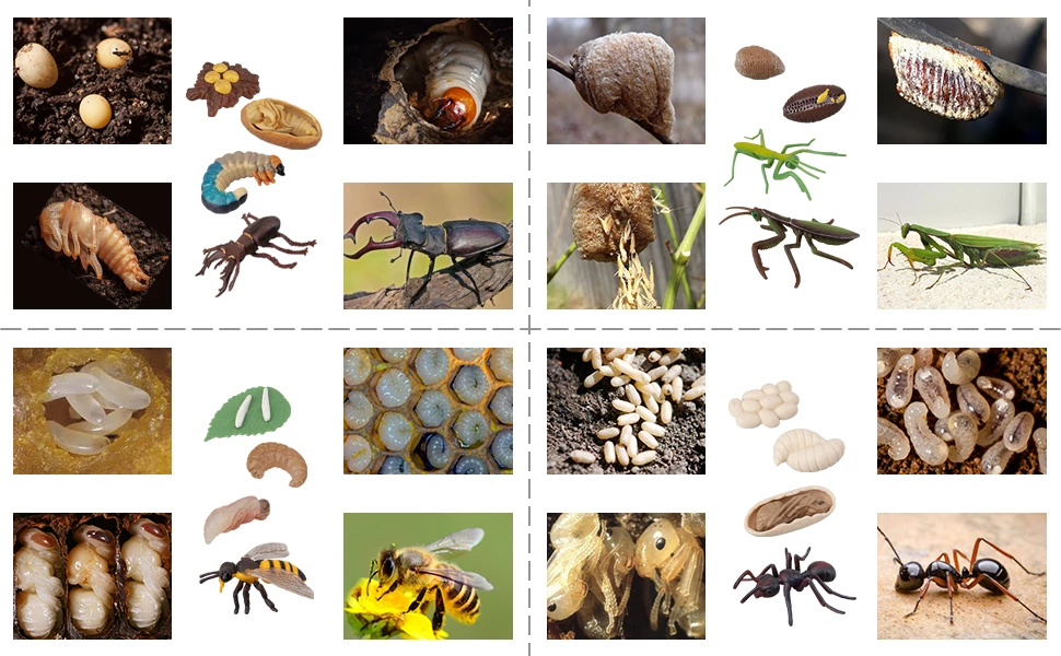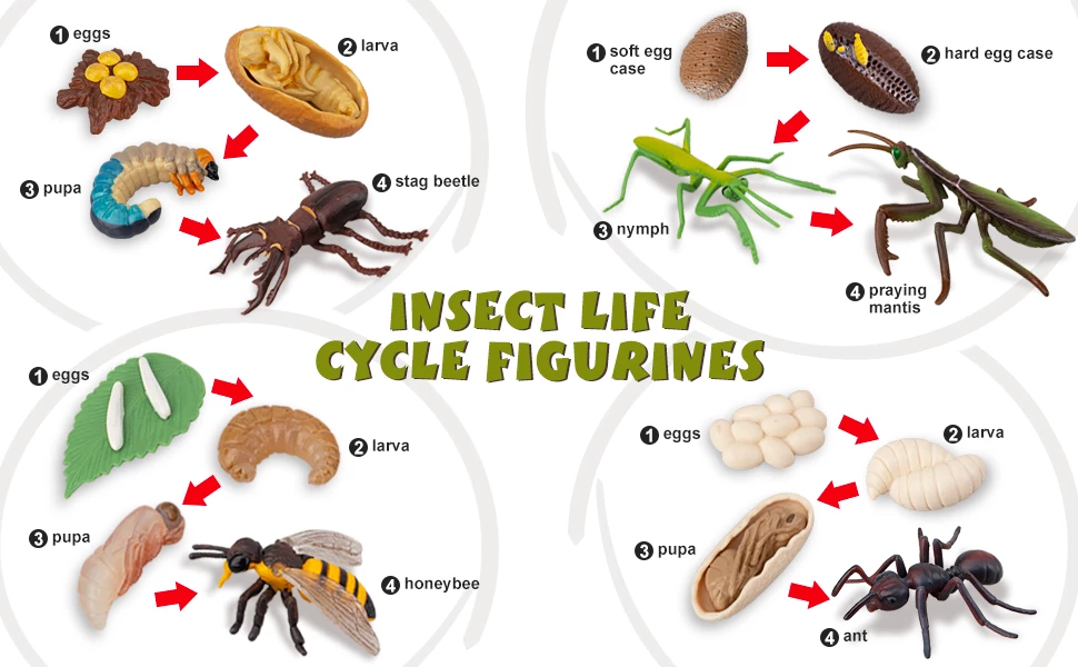 Представлені 4 фази життєвого розвитку богомола, медоносної бджоли, жука-оленя і мурашки. Фігурки виготовлені з нетоксичного і високоякісного матеріалу.