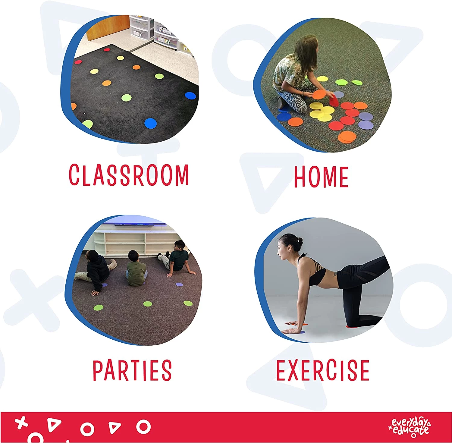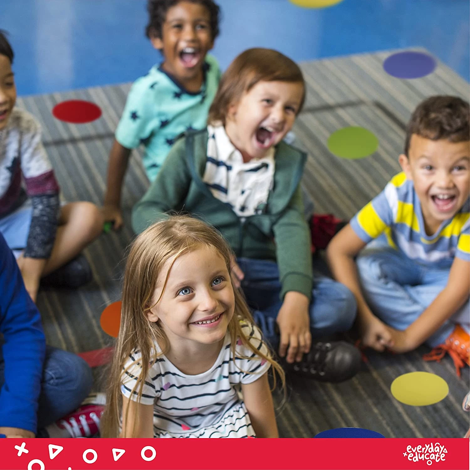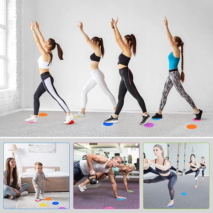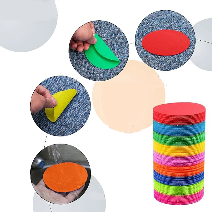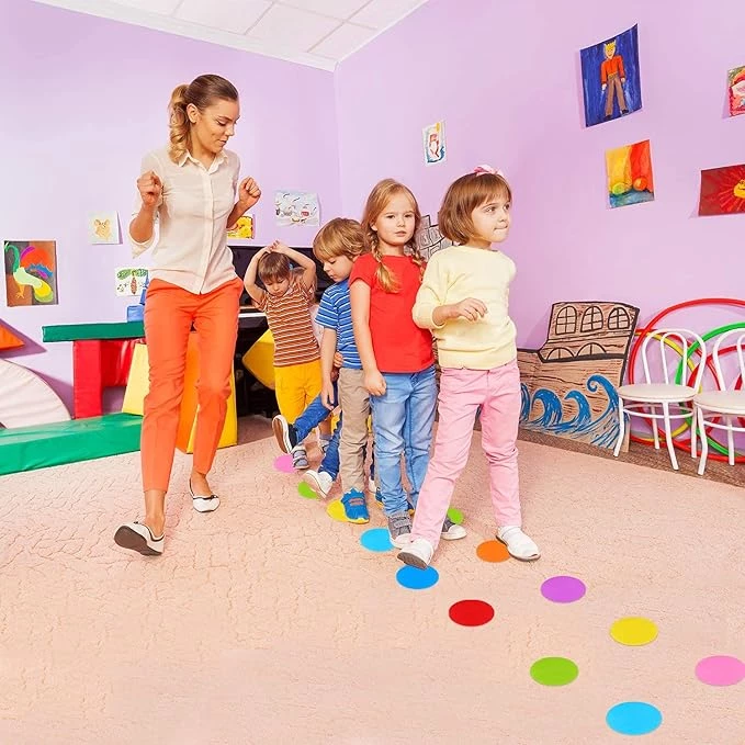 Ці плями-маркери, допомагають дітям вивчати кольори, швидко й точно визначити місце в черзі або місце для сидіння чи стояння. Прикладіть невелику силу і готово. Якщо знадобиться змінити їх положення, просто зніміть їх, і вони готові до використання.