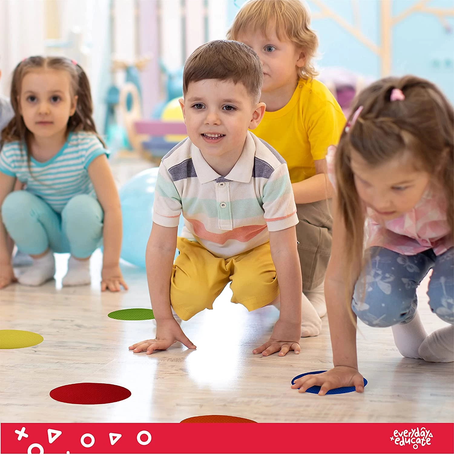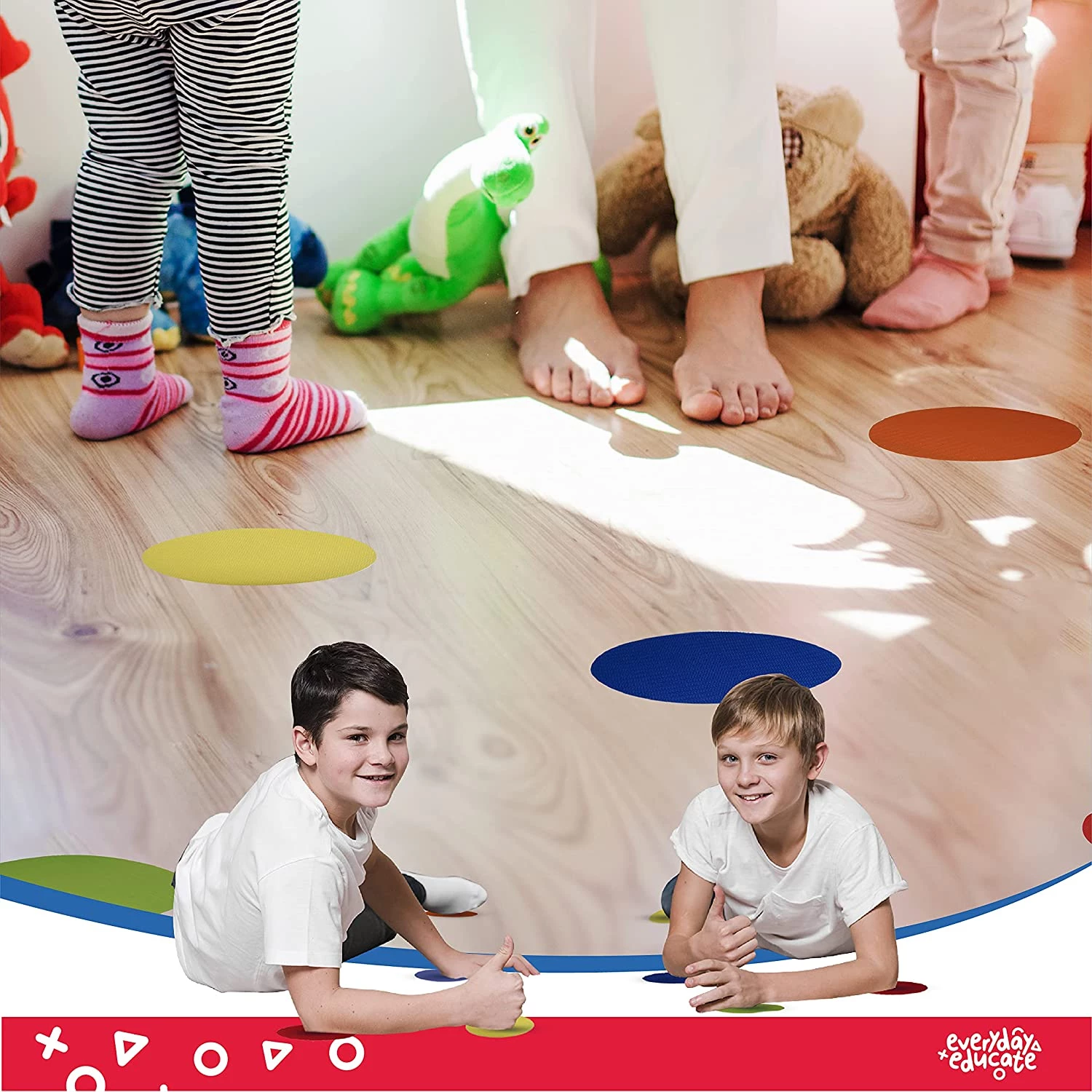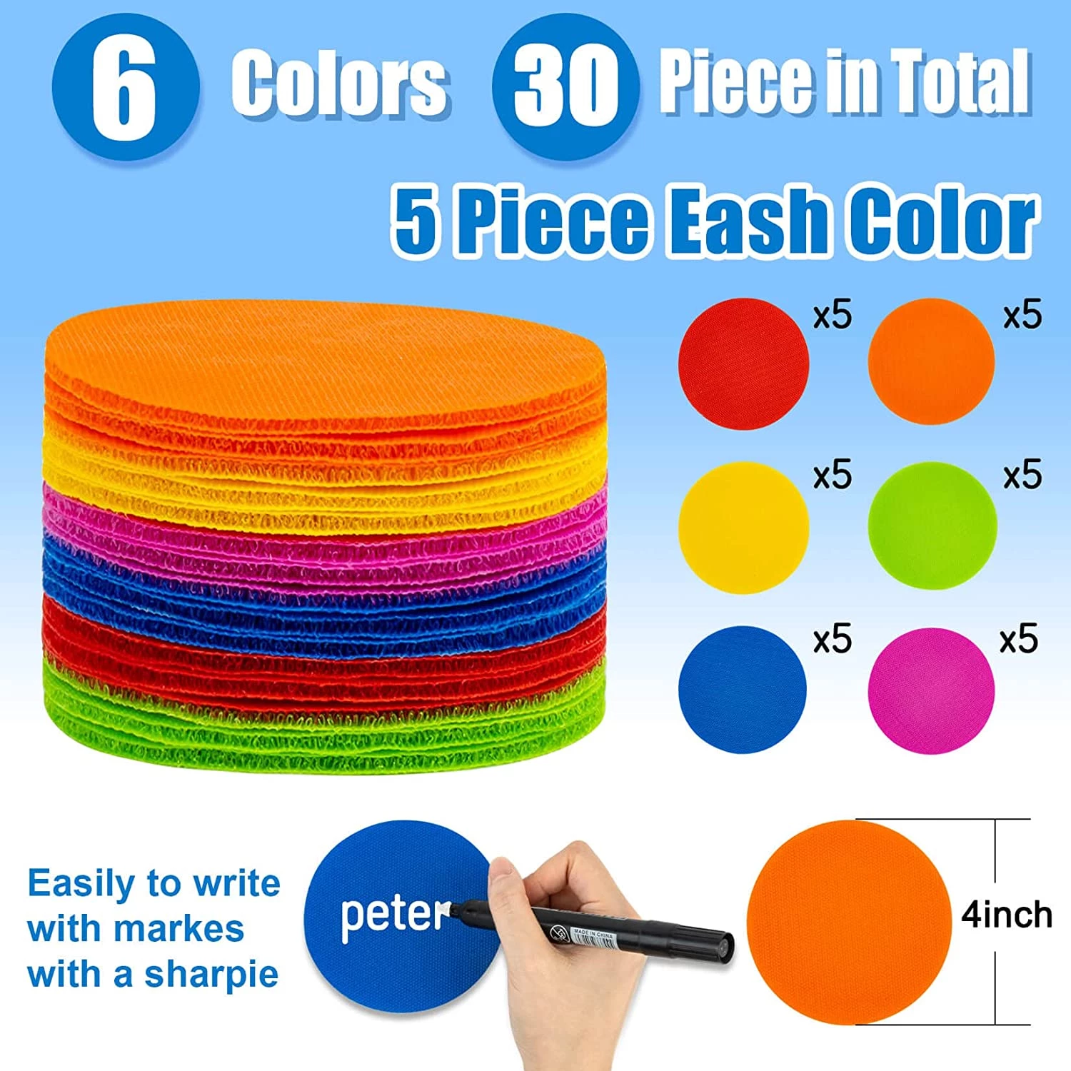 Ці плями-маркери, допомагають дітям вивчати кольори, швидко й точно визначити місце в черзі або місце для сидіння чи стояння. Прикладіть невелику силу і готово. Якщо знадобиться змінити їх положення, просто зніміть їх, і вони готові до використання.