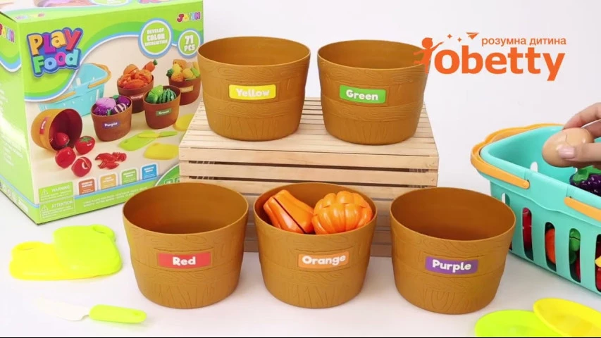 Пропонований набір сприяє розпізнаванню кольорів та вчить сортування за допомогою кошиків та ярликів з різним колірним кодуванням (фіолетовий, зелений, жовтий, червоний, помаранчевий). Ці іграшкові продукти перетворюють навчання на веселе заняття.